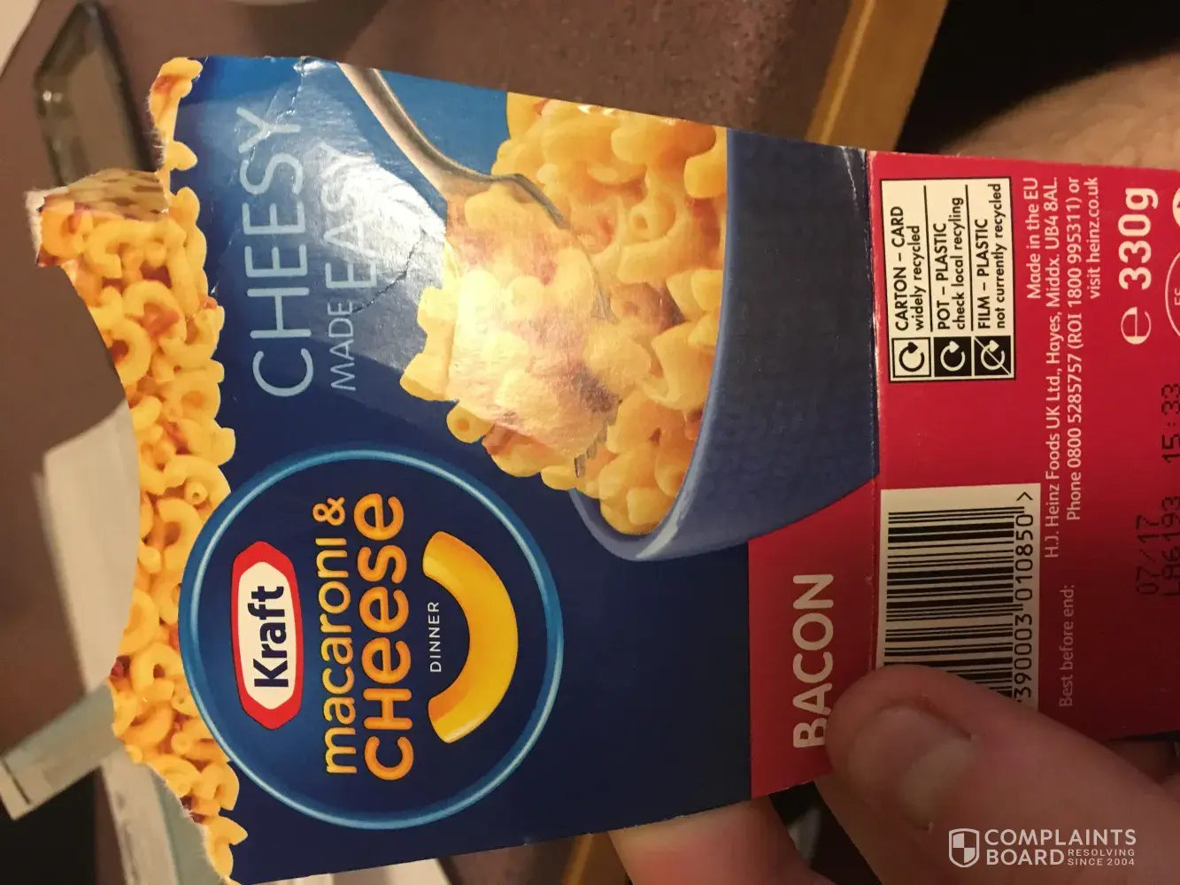 I went to make a box of Kraft mac n cheese(upc [protected]), and upon pouring the noodles into the boiling water I discovered little dead bugs in the box. (The box was intact, so there was no way they made their way in there while in my possession) This made me very sad, as it was my last box and now I have no macncheese. I'm wondering how I can be compensated for my loss.