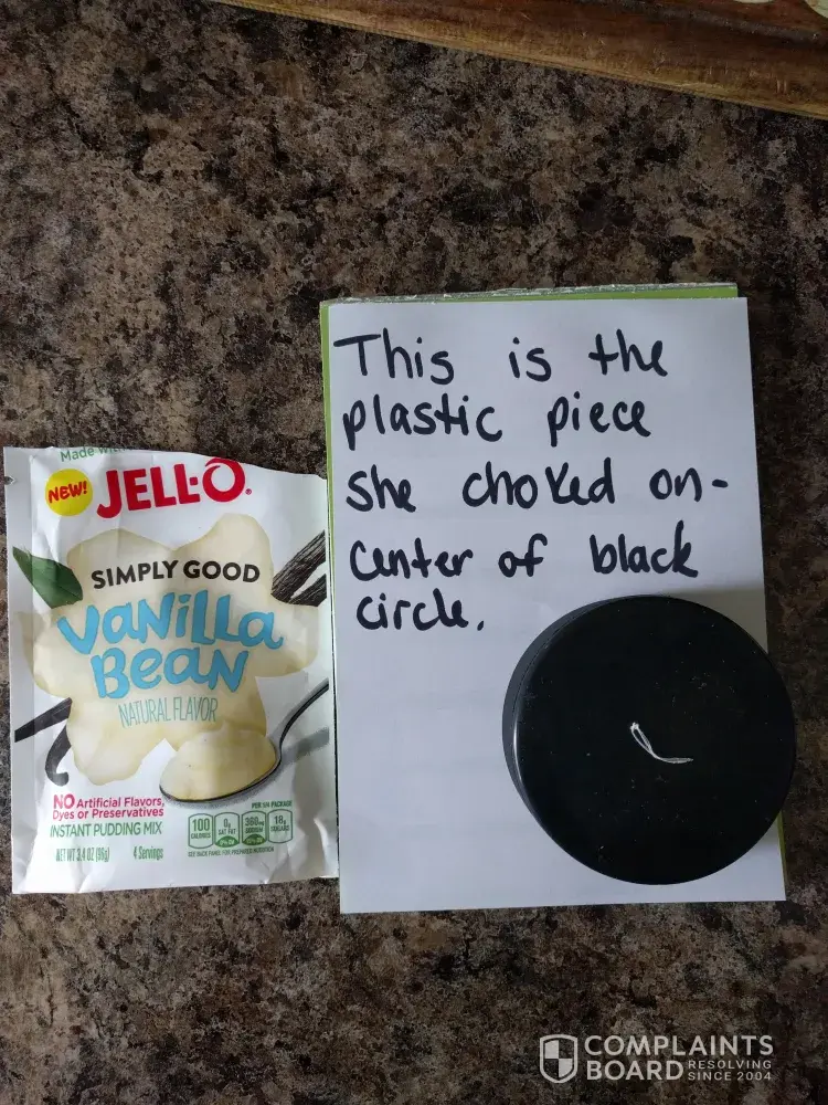 My daughter made this pudding, ate some and started choking! There was a piece of PLASTIC in the pudding! I am providing a photo of what was in the jello packet. I am extremely aggravated & upset this was in the pudding, yet relieved she was able to get it out of her throat. This is NOT acceptable! Is there a recall for this product?