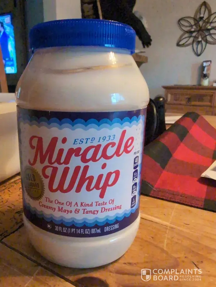 I opened a jar of Miracle Whip which I purchased recently, and it was improperly sealed, so the sauce was dried out and the top part was congealed. I got this product at Aldi in Maplewood, MN in the last few weeks. This is the first time I have ever seen it like that.