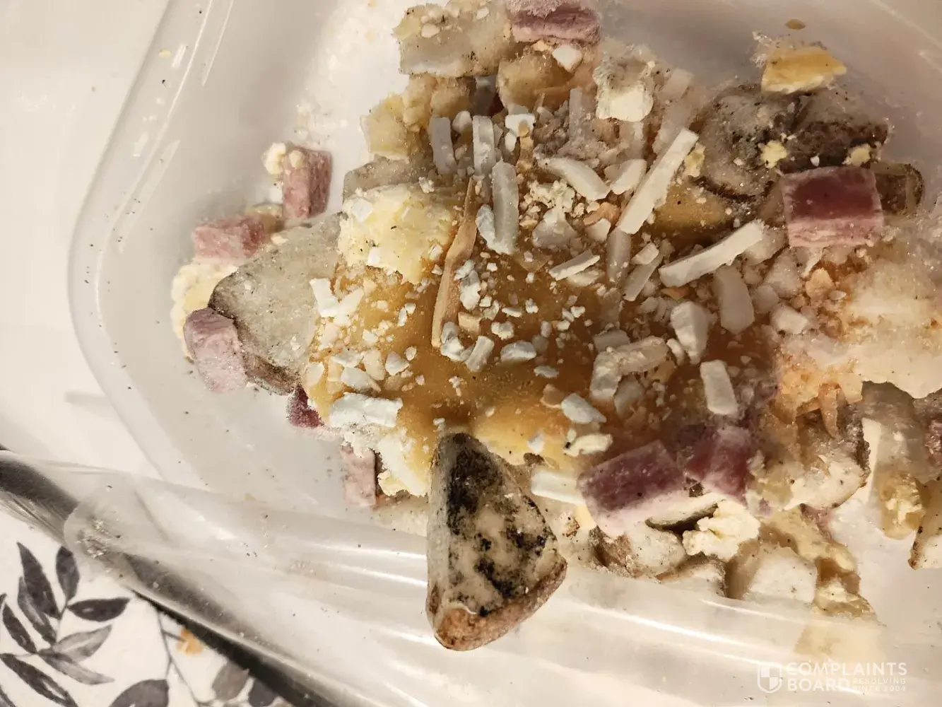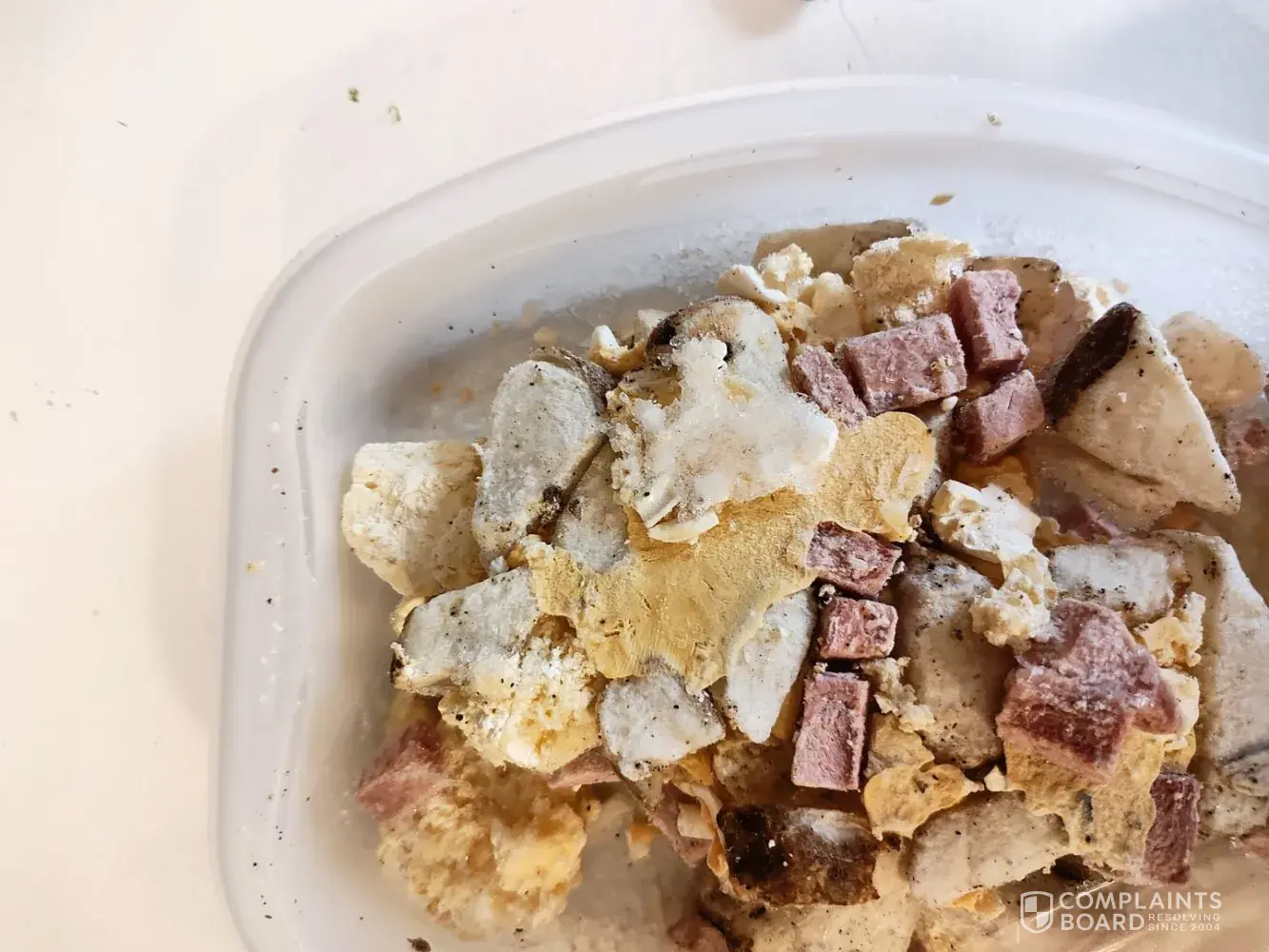 I purchase Smart One Ham and scramble at Walmart. I saw something black so I peeled back the film. the ham and scramble had flecks of mold all over the food. Mold does not grow on frozen food so somewhere in it journey to the freezer case these Smart One Ham and cheese Scramble untthawed sat long enough unrefrigerated to warm enough to grow mold.