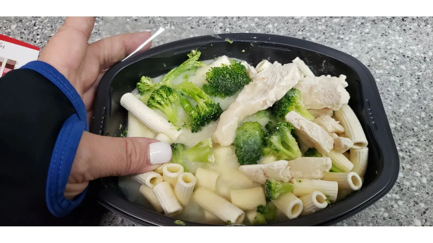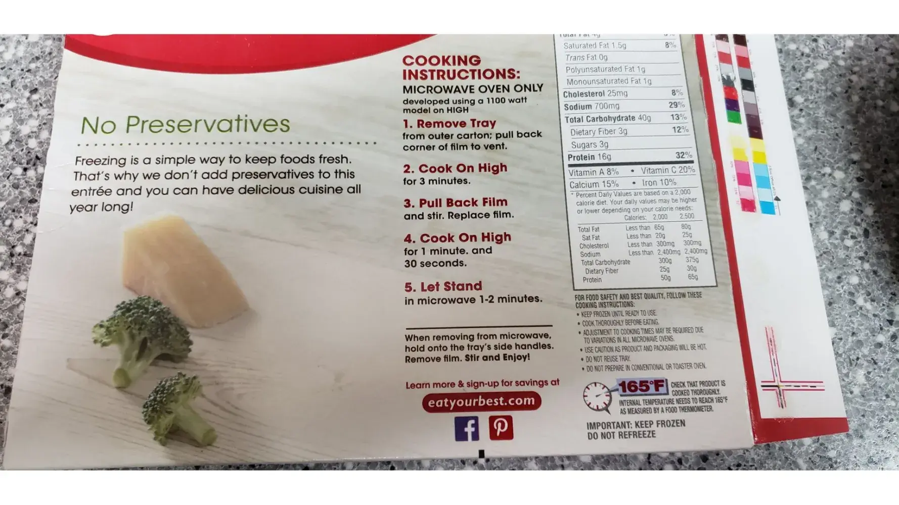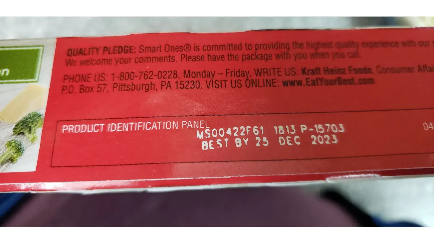 When I opened the box to pull out the meal I immediately felt the frozen food and when I looked, there was not plastic covering on the dish. You can see that the chicken looks frost bit. There is just a tiny piece of the plastic covering in the corner but was not in the box. The packaging information and identification is in the attached images. Thank you, Beth Smithingell [protected]@baker.edu