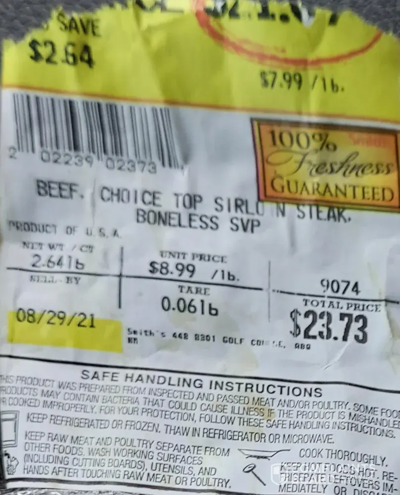 On August 27, 2021 I purchased a package of top sirloin steak. I also purchased other items. When I brought the steak home and cooked them on the grill. Two of my guests took one bite and spit out the meat. The meat appeared to be contaminated. It was mushy almost like chopped steak in the middle. One of the steaks had this strange hole in the middle of the meat. The outside of the steak appeared to be find. The other two pieces of steak that were in the package were fine. One of my guest woke up the next day with a severe headache and nausea. I am attaching the product label and receipt for your review. I want to know if you have had issues recently with this product. I want to make sure the meat wasn't contaminated with something that will potential cause medical issues with my guests. I also would like a complete refund of all my groceries for that purchase since! My meal was ruined! $70.95