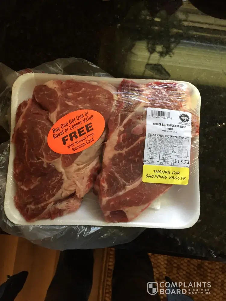 For the "buy one get one free" beef chuck roast promotion, I got one pkg. with 2 little pieces of meat that looked more like small steaks than chuck roasts. I usually buy one chuck roast that's approx. 3.5 lbs. while the total of both these tiny roasts was a little over 2 lbs. Seriously?