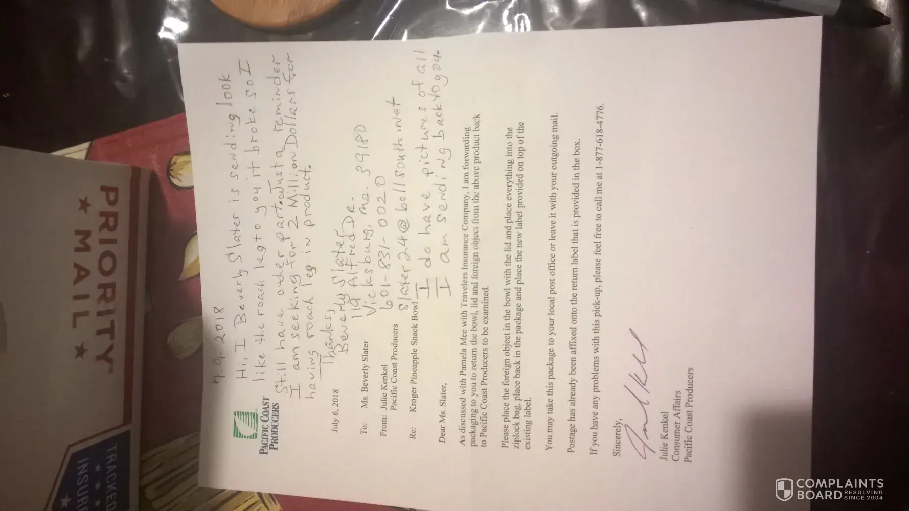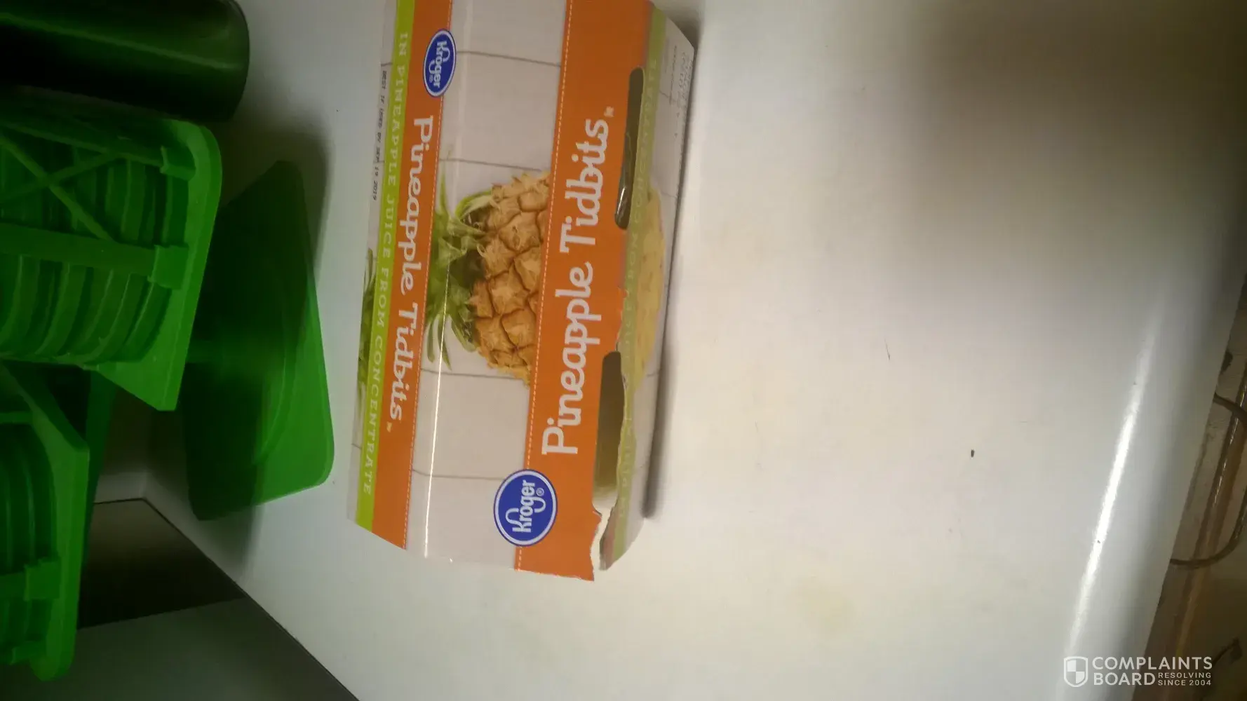 I Beverly Slater of Vicksburg, Ms. 39180 purchase a 4 pk. of pineapple tidbits and happen to see a roach leg or something in the pineapple container which I was eating from package dated Best if used by Sep 19, 2019. I am sending pictures of container and package. I hope you can see leg of insect or something in container. I was asked to send insect leg to Travelers/Atlanta Claim Service Center to review after Pamela Mee called me and said it looked like a stem from product to them, l did inform her it look like some type of leg to me at that time. I sent a piece of the leg because it broke and I still have the other part, l don't know who look at piece of leg but you all need to get someone else to view because I am sueing for $20 Hundred Thousand Dollars for having a leg in what I purchased .