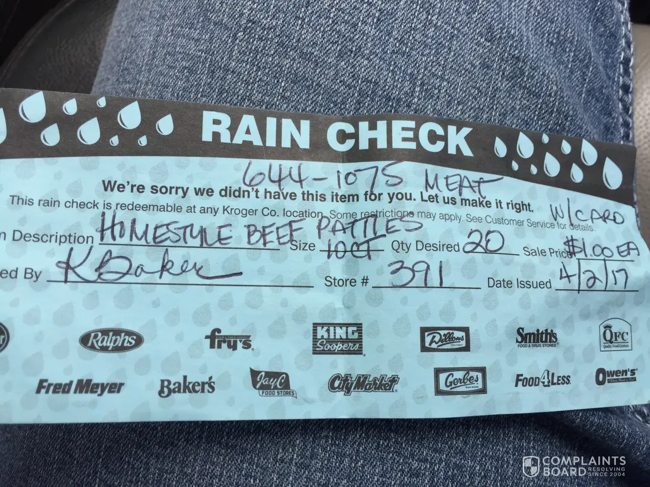 The manager, Joe Turner, refused to honor a rain check. He advised me that I was reading it wrong because the manager, K. Baker, doesn't know what she's doing. Ms. Baker wrote the rain check while looking at the sales paper. A copy of the Rain Check is included.