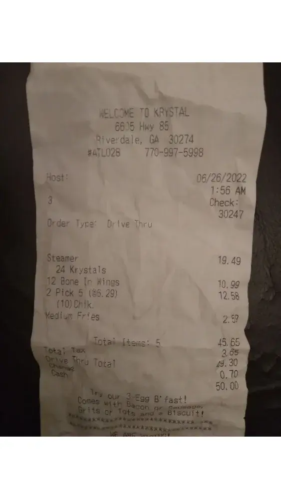 Krystal on 6605 Hwy 85 /date [protected] at 1:56 am check # 30247. /The food was not cooked properly and when I seem that I was very disappointed. A 24 pack of Krystal my friend had drop me off at home. The line was long that gives them no reason to rush the cooking time.