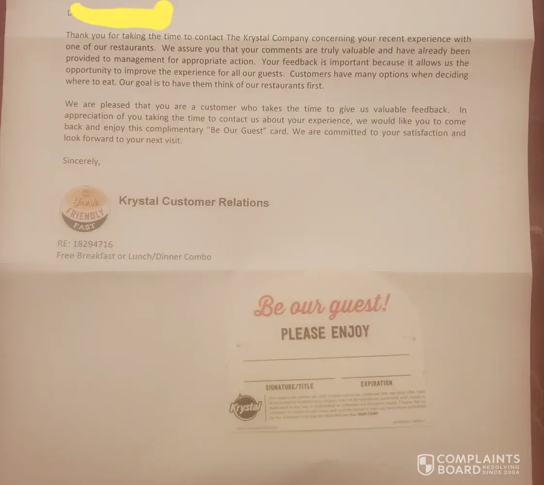 On Sunday 3/3/20 around 7 pm, my family and visited the Krystals drive thru lawrenceville hwy in Decatur GA.We were greeted with YO!YO!YO! can I take your order. We are a family of 4, so we ordered 4 drinks, 4 fries, 12 krystals, and 3 chili cheese pups. When we arrived at the window to pay, the cashier said, Dang is Ya'll hungry. While our drinks being prepared, the same young lady had to be instructed not to give us drinks without lids. We were ask to pull forward and our food would be right out, after about 25 minutes there was not any food in sight.My husband went inside to see what happened and still waited an additional 15 minutes for our food to be prepared. I contacted the local office to advise of my experience and requested my money back, but received a coupon for free breakfast or lunch comb. The amount spent, almost 50.00 was solely based on convenience and not class or service.I frequent this location early Mornings and have never had this experience. Someone, please give me my money back!