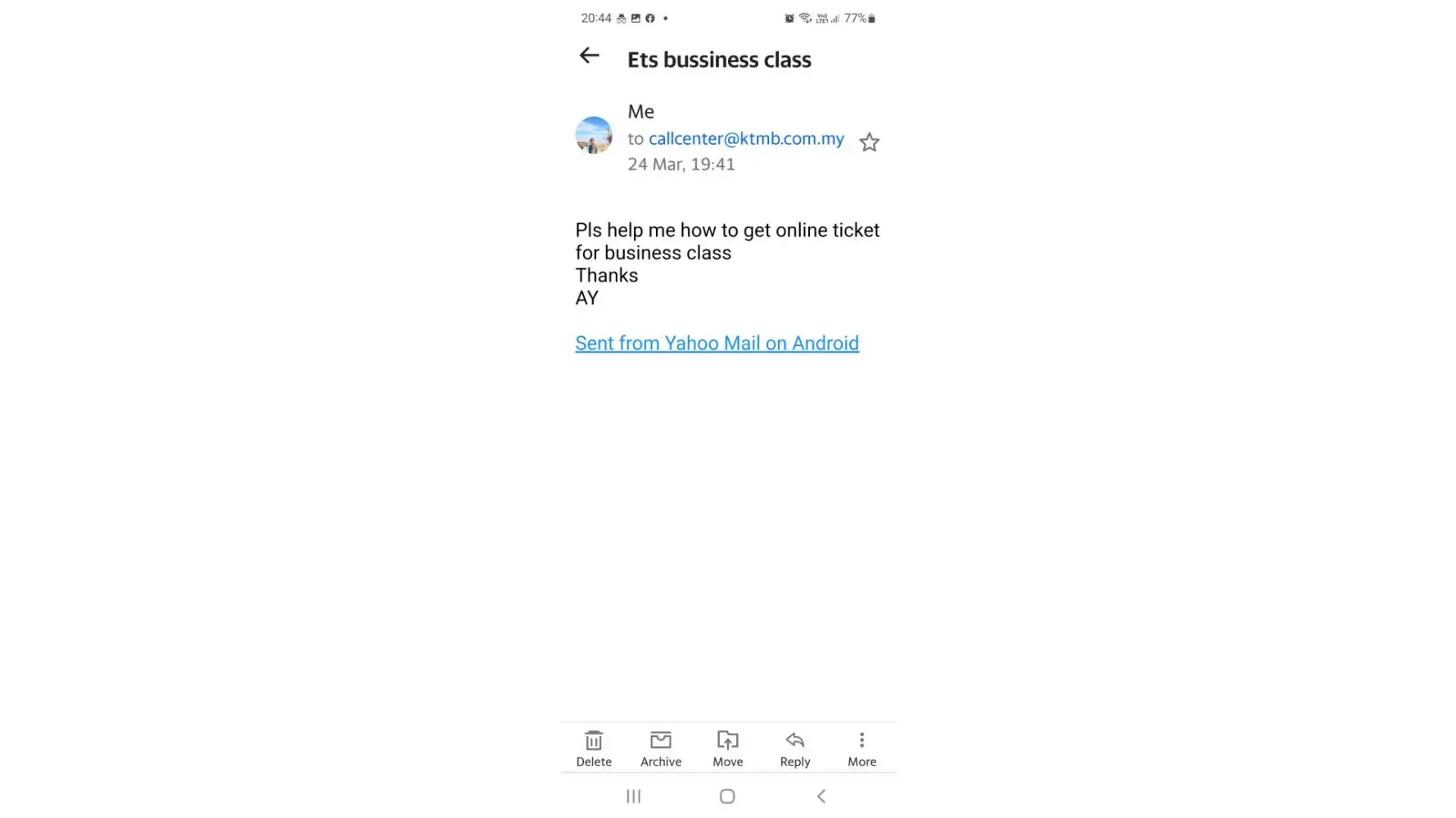 Enquiry by email on ets business class