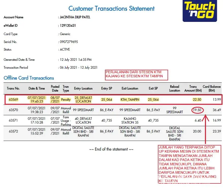 Saya telah menaiki KTM dari Stesen Kajang ke Tampin dan ketika ingin akses keluar menggunakan kad TNG saya, mesin tersebut menyatakan baki dalam kad saya tidak mencukupi, di mana jumlah dalam kad tersebut lebih daripada mencukupi untuk perjalanan saya pada ketika itu. Oleh yang demikian, saya terpaksa keluar dari stesen tersebut untuk mengisi jumlah dalam kad saya (stesen tersebut tidak mempunyai kaunter untuk menambah baki dan saya telah dibenarkan untuk keluar untuk mengisi jumlah kad saya)