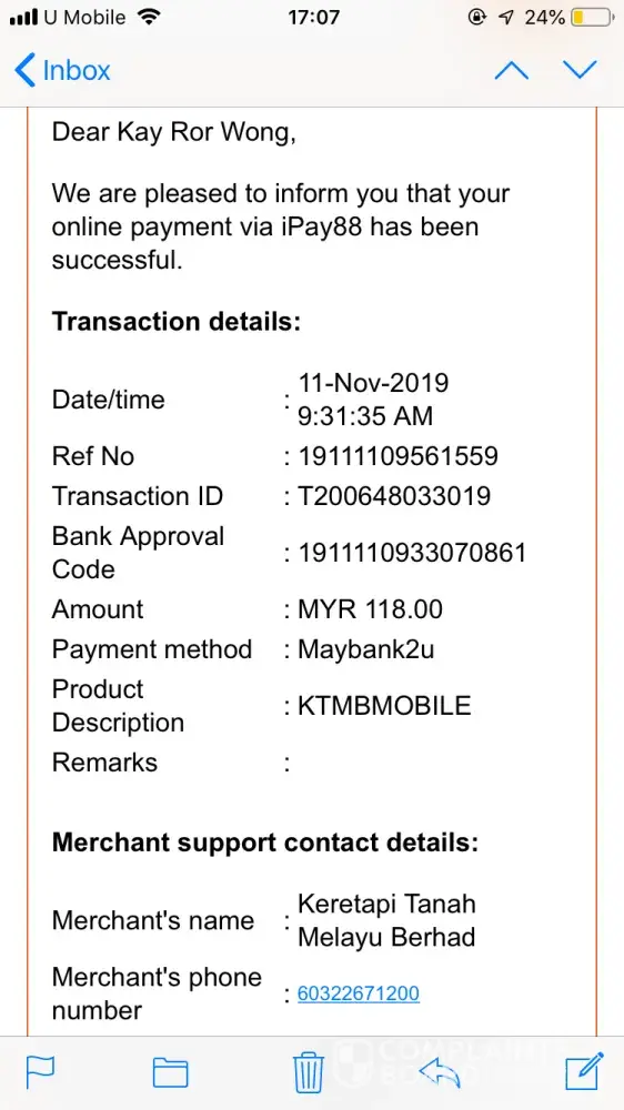 On the 11 Nov 2019 at 09:31:35, I using your ktmb mobile ticket to buy 2 ticket from butterworth to KL Sentral at 0730. I had done my transaction using Maybank online payment via iPay88 RM118 already deducted from my bank account but today I going to print ticket at train station Alor Setar but the worker said that didn't have any ticket brought by me. So I called call center and asked. The call center who attended me told me that my ticket does not success but my money already deducted. How can be like this now I need to pay RM158 to buy another 2 ticket at 0605. I very angry why when I paid u all didn't give me the ticket and didn't give me a call if the payment had not successful. Please be responsible on your work. Don't make a shame although I am a Malaysian. Please have a look into the complaint and make your service better especially online. Thanks for your convenience on this complaint.