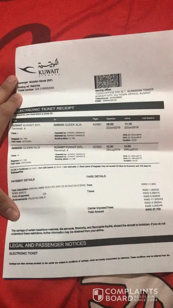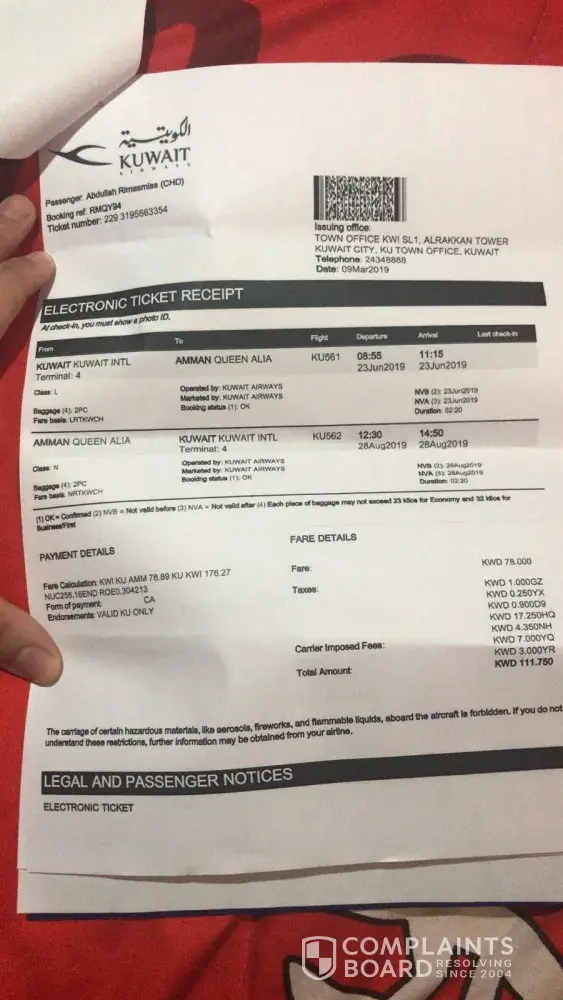 I booked the ticket for my all family(my wife, two children and one infant)ticket number.[protected] .when I check my ticket my wife last name is wrong, and I go to the kuwait airways building in avenues and from office correct the name and I spend money for this(10kd), then I print my ticket and from office they told everything is ok, but when I check the ticket no information about my infant only, the officer not additional the ticket my infant with my wife, I already informed the customer care service and he told go to the office in avenues and add additional infant and please I need a investigation regarding this