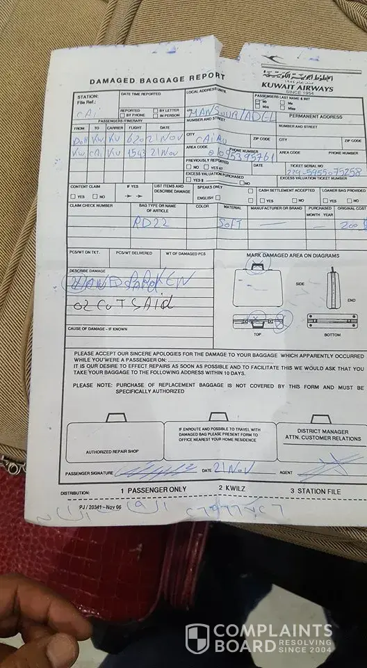 There was no Kuwait Airways counter at Amman so I was directed to Aviation Handling Services who handles Kuwait Airways and the person there Wael Shuhaiber (Who wrote his name down when I asked for it Pic attached) Said Kuwait Airways does not give them authorization for addressing complaints on Broken bags and I have to e mail Kuwait airways with regards to this.