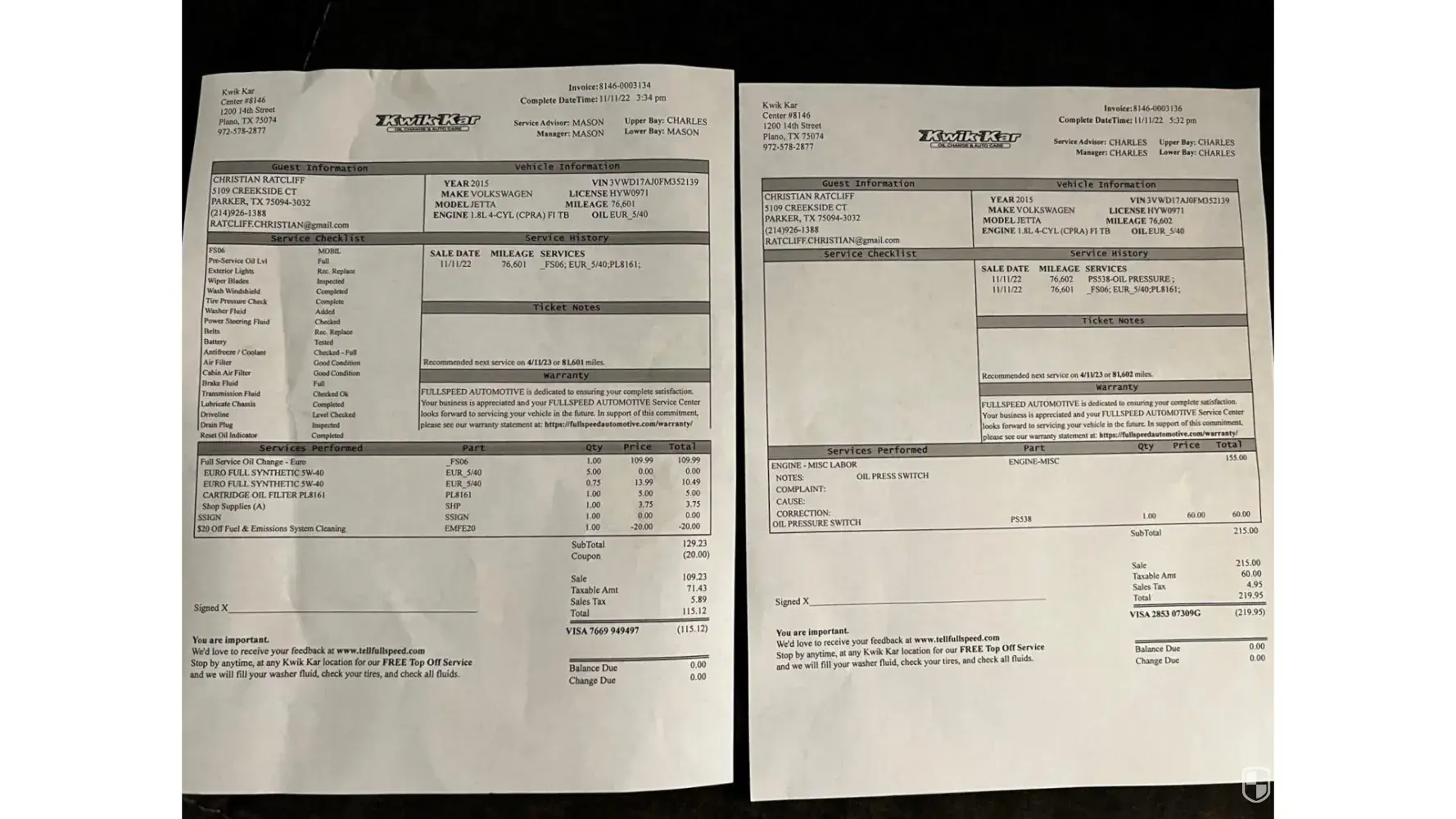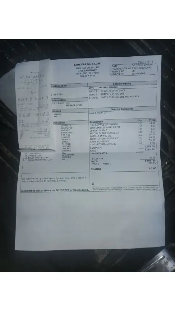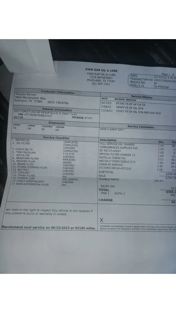 Yesterday (12/14/23), we had an oil change done at the Kwik Kar @ 1820 Brown Blvd., Arlington, TX 76006 (Invoice #5603096).
