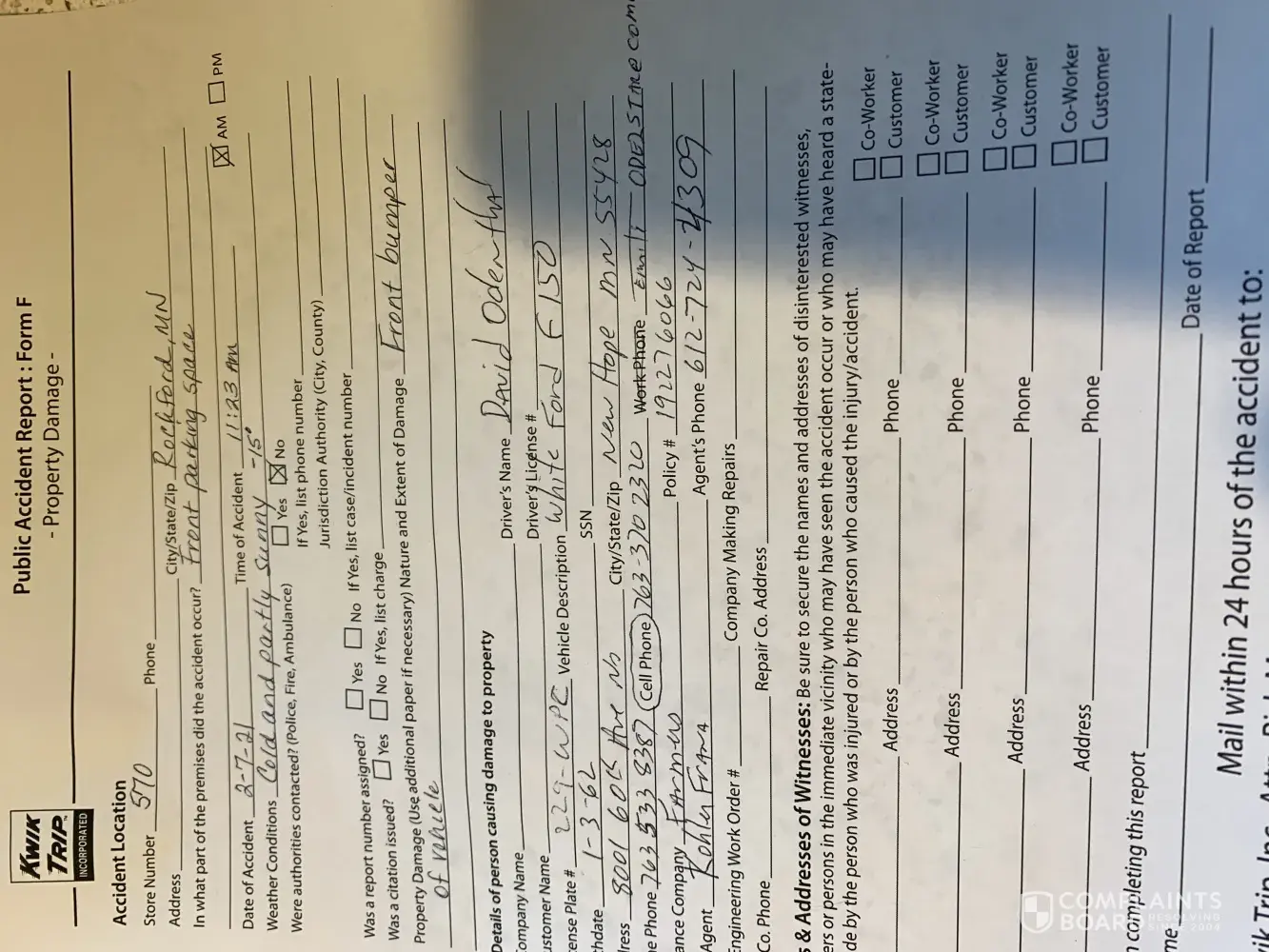 Manager was good about it and wrote a accident report.