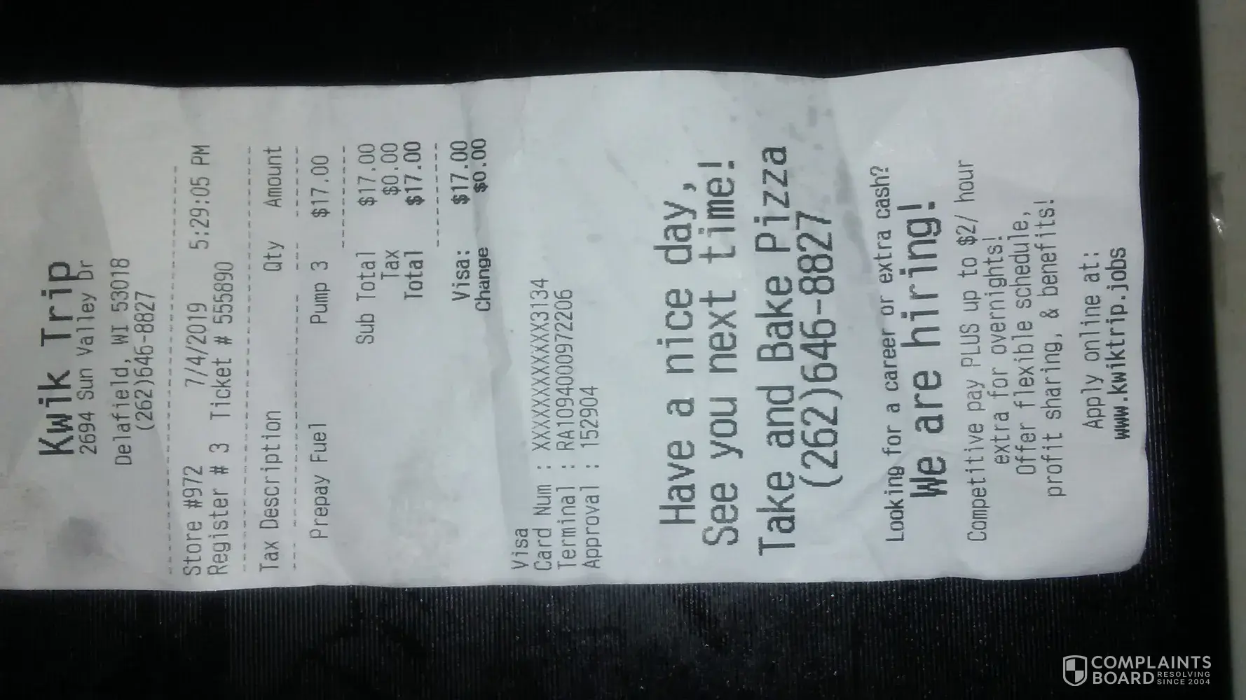 On July 4th 2019 529 p.m. customer paid by credit card $17 on pump number three. Although T pump was paid for inside, the pump ran past the set amount my $3.21. Before customer could go in and pay 4 for the overcharge it was assumed that he was going to run away from the pump. Therefore, his credit card was charged $3.21 before he can go back inside. Although the credit card can be refunded right away, is supposedly 2 have the amount refunded within 24 hours. This action happened at the QuikTrip located in Delafield Wisconsin 26 94 Sun Valley Drive at 5/3 018. Store number 972, July 4th 2019, 529 05 p.m. register ticket number 55589 0, prepay fuel pump number three $17 although pump number one was confused 4 pump number three in the amount of $17. Card number ending in 313 4. Terminal number r a 1 0 9 4 0 0 0 9 7 2 2 0 6 approval number 152904. More thoughts should be headed towards action instead of assumptions. Email, [protected]@yahoo.com.