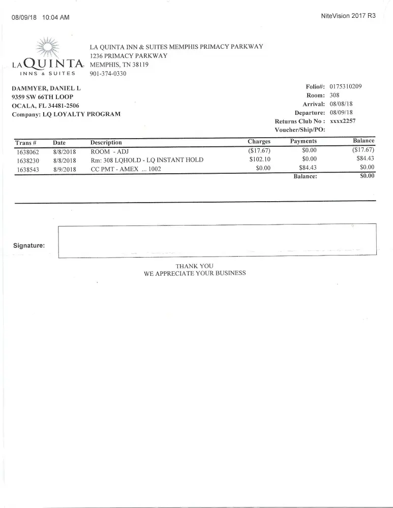 I visited La Quinta Inn #0928, On 8/03/18 and during my visit there was a storm and while this visit they had been working on the roof shingles were left loose, and no precautions were advised to eliminate probability of vehicles being damaged during this time, when I wake up to head out to my destiny for the day I come to find out my vehicle a Black Ford Pickup was scratched deeply damaging the paint, in three different areas, my vehicle is 2018 and due to this incindent it will loose its value, another vehicle was damaged during this same incident for the same reason, I am asking that my petition for my damaged vehicle Be reconsidered, I am aware that as a business insurances should be in place to cover these costs, I personally have to purchase insurance to cover any incident in my home, I don't see how you guys say that you guys can not be held liable, if you can't the business who did your roofing should have insurance aswell to cover these incidents...I have pictures that were taken when the incident was revealed, please contact me for more details