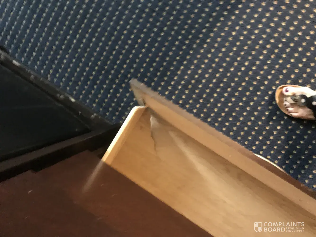 I stayed at la Quinta Inn in Manchester, NH on May 11th when I was picking up my child from college there was a drawer in the bureau in room 229 that kept drifting open. I shut it hard and it seemed to have closed.in the. Ugh this I got up to go to the bathroom and fell over it hard. It has drifted open again. I hit it so hard the drawer cracked and I fell down hitting my leg and thigh and my head on the ground. It was a scary experience, I lay on the ground for awhile until I had assessed the pain level as well as I could.in the morning I got I told the manager and he comped my room and promised me he would have it fixed. He would have to, actually as it was actually cracked and broken by my fall.