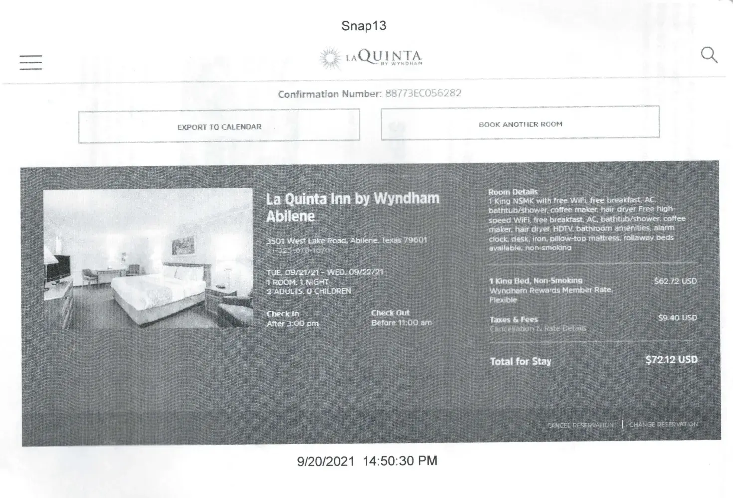 I stayed at the Abilene Laquinta on September 21 after making a reservation using the Wyndham Laquinta reservation system.