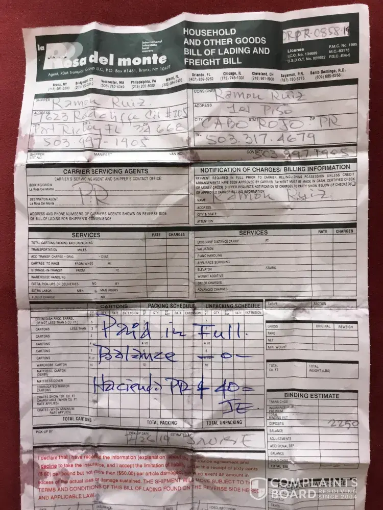 La Rosa Del Monte is UNPROFESSIONAL company. Don't give them your business. Moving from CT to Florida was a disaster! My furniture arrived 3 weeks late. And some things were broken! I moved to FL. Oct 3, 2008 and I'm still waiting to get a refund check for my damaged goods. If you do decide to go with this company, READ THE FINE PRINT ON THE CONTRACT. This is why I had to reported them to the Better Business Bureau. I suggest anyone that has a problem with this company do so as well.