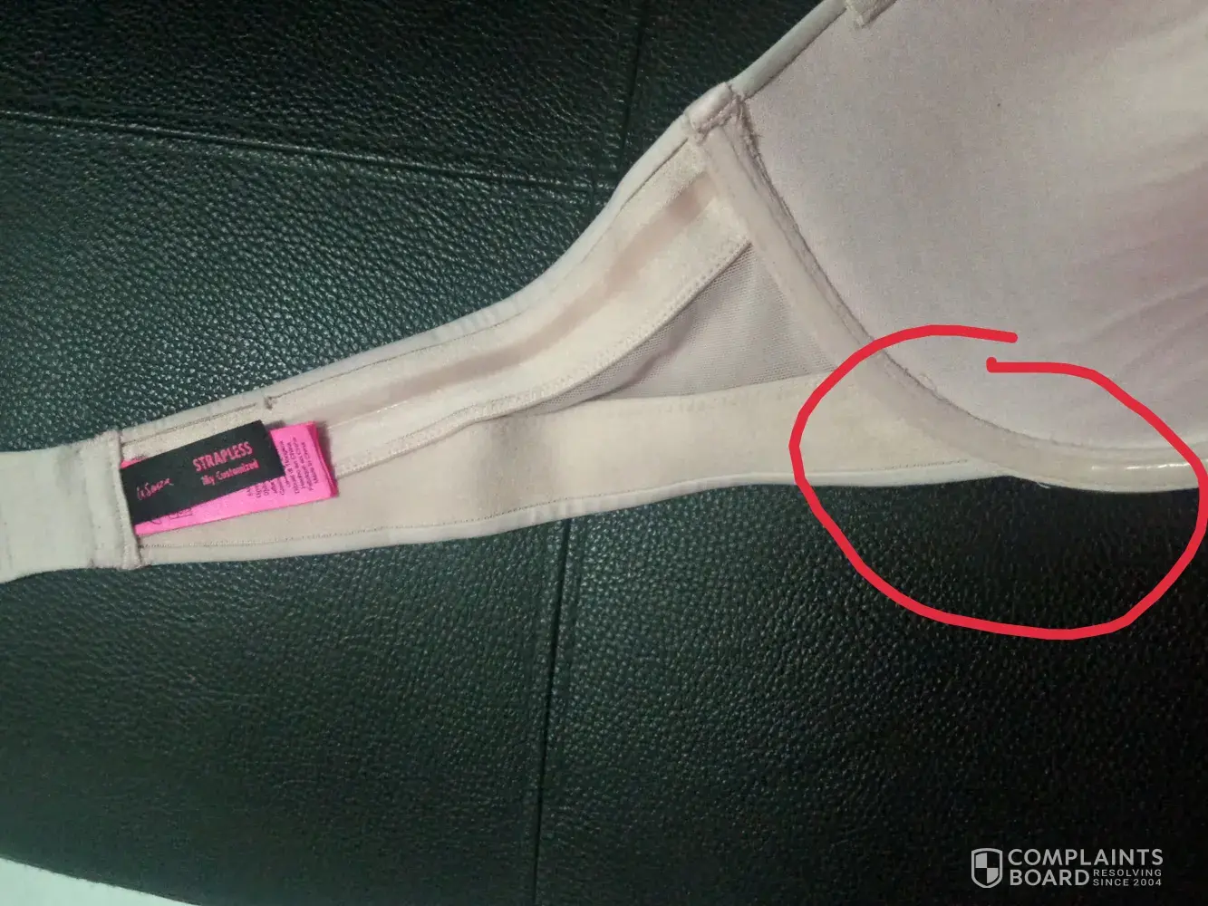 Bought this strapless bra from La Senza. I only wore it few times whenever I'm wearing off shoulder. The lasst time I wore it was 2 weeks ago I noticed that I had a burn on my skin with the shape of the lining of the bra. The actual photo of my burned skin got deleted so I attached this photo attached which was taken today where you can see the scar. As you can also see on the bra style there is an adhesive (I don't what it's called) I this is the thing that make the bra stick on the skin and also I think is the one who caused the burn on my skin.