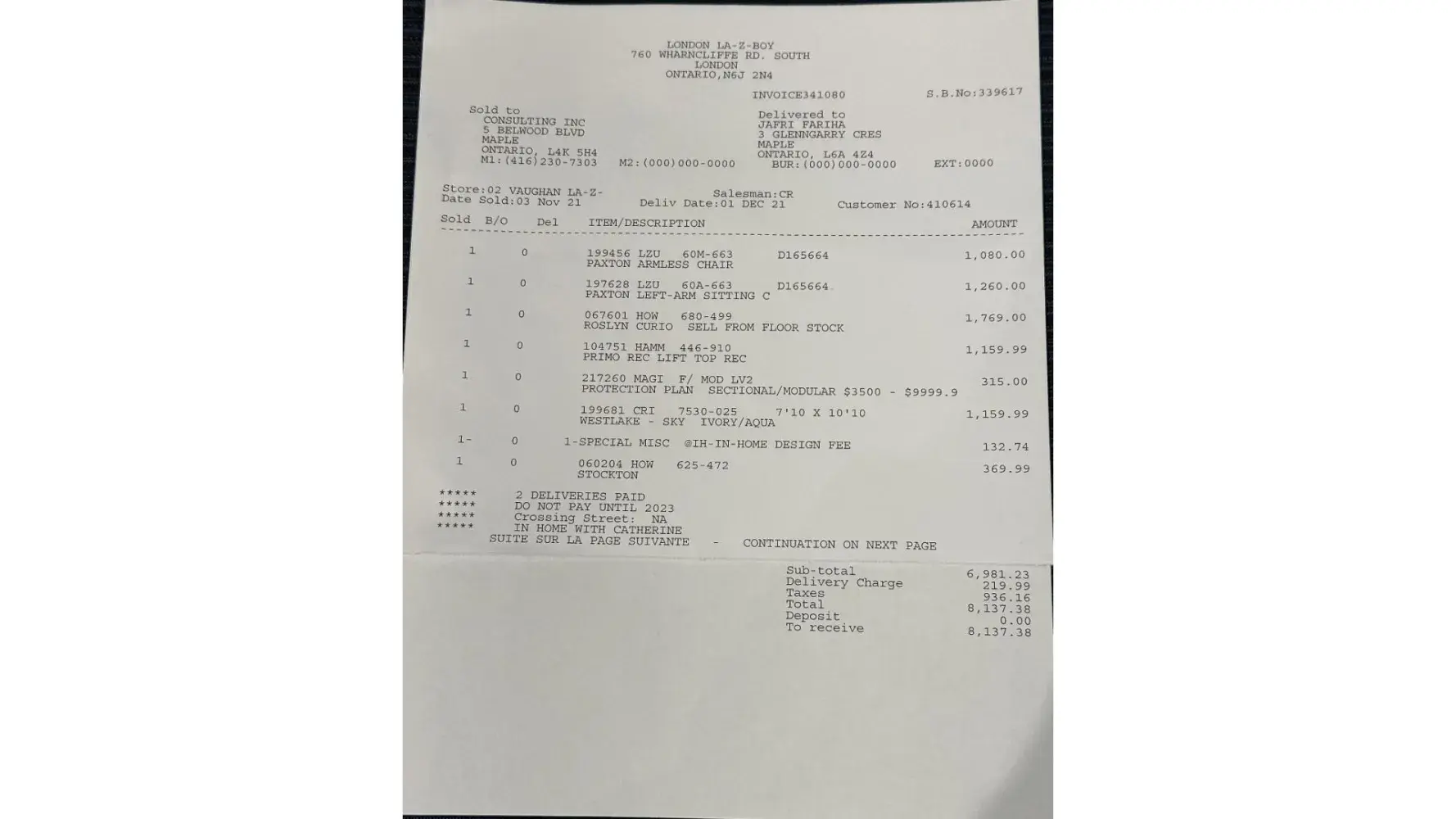 In first delivery there was a curio cabinet that was missing a glass shelf. We informed the sales consultant of that immediately. The second point of contention is the interest we were charged by Flexiti, La-z-boys financier. I received a statement which shocked me traumatically when I saw it! I called Flexiti to discuss the extortionate interest charged of $5366.49 on a balance owing of $4436.38! Despite several and constant follow ups: calls, texts, emails, visits to the store, messages left for and conversations with the sales consultant, and then the assistant manager, manager and customer service director, these issues have remained unresolved.