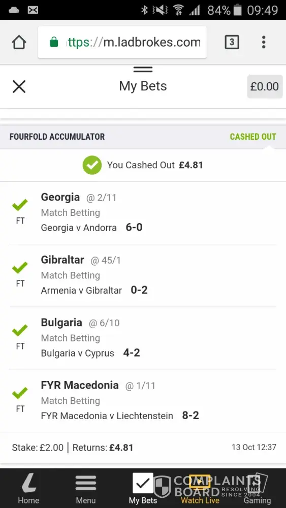 Put a bet on in my local Ladbrokes BTTS and Win and I said it would be 1-1 in Middlesbrough game going onto the 3pm ko I said BTTS AND WIN on WEST BROM and KILMARNOCK game both were sitting at 1-1 on the 71st minute ... I had been checking my cash out all the way through and getting straight on no problem to the grid from 71 minutes to FULL TIME nothing, thought it was very convenient that I couldn't get back on the Grid for the opportunity of a cash out just kept saying loading 😂😂😂 what a joke .. when I went on complaints it seems to be a regular accourance with Ladbrokes so I won't be back !