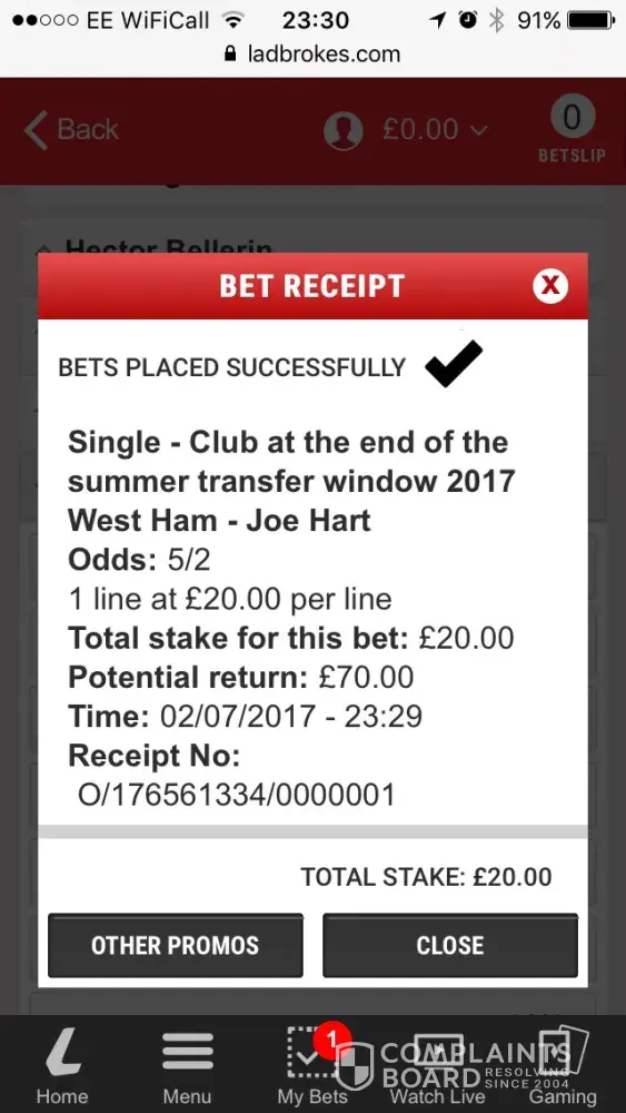 Pre season on 2 juy 2017 I placed a £20 bet on joe hart club at the end of transfer window to be west ham utd odds 5/2 so a £70 return. I am aware he is now on loan at whu however the bet did not state that he had to become their own player just the club at end of transfer window... Please pay up or I will take this further and never use ladbooks again for future business and inform as many people on social media of the incident as possible. Receipt number is o/[protected]/0000001