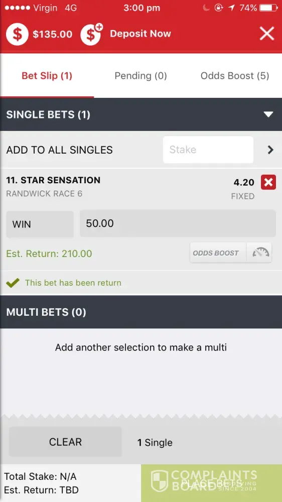 Hi Guys, I placed a bet on Randwick race 6 today (7/11/17) I placed $50 bonus bet on number 11 on a fixed place. I got $135 back and I was estimated $180 and then when I looked back at the slip it had jumped to odds of 4.20 and said I would get back $210 Which wouldn't make sense because it should have been $180... but then only got $135 so just wondering how this happened? Thank you