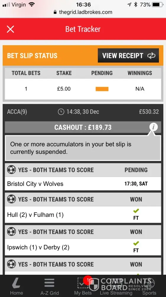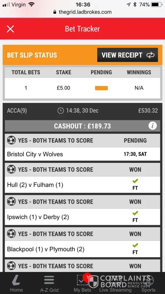 I did a bet with Ladbrokes they have a site called the grid. If you are winning on your bet this site enables you to put your receipt number in and it will offer you a cash out. This is not the first time this has happened that it offers you an amount but you can't take it. I have enclosed 2 snap shots of my offer the first is in grey with a information sign. The second shot is what it says when you clic on the information sign it says some rubbish that this is not the case. I was only waiting for Peterborough to score with another game starting at 5.30. Ladbrokes are scamming people and it's not on. Why show me a cash out amount that you just can't take. Something has to be done about these cheating bookies.