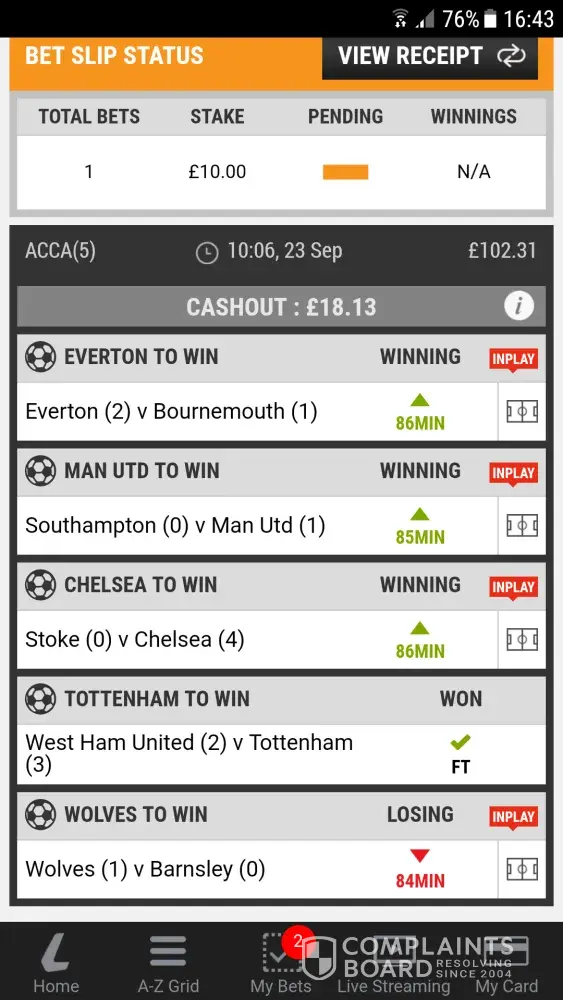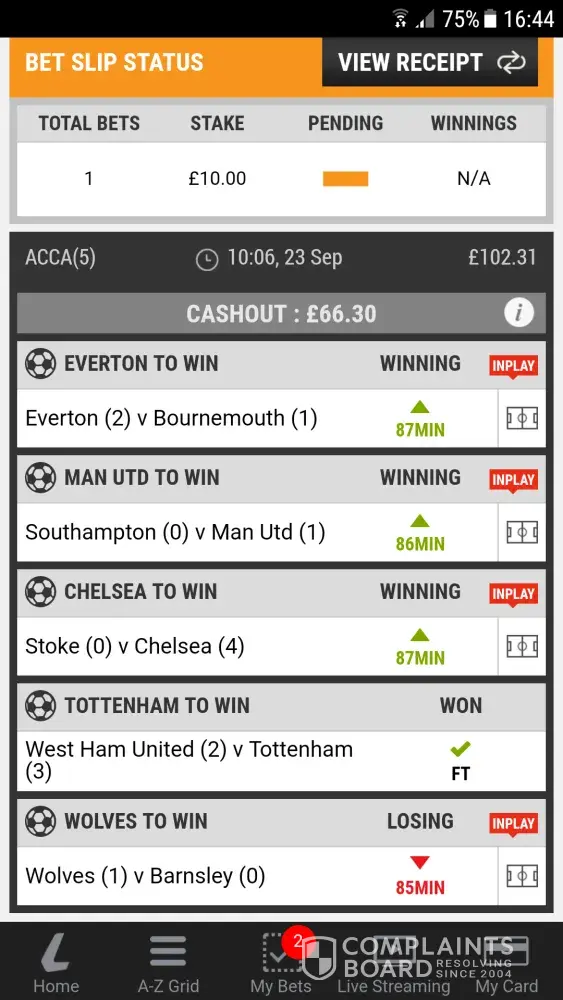 Again the bet ended up winning but I wanted to submit a complaint as this is a disgrace and you will also see proof in the images attached that Wolves were winning amd the cashout kept rising yet it stayed saying 'losing'.