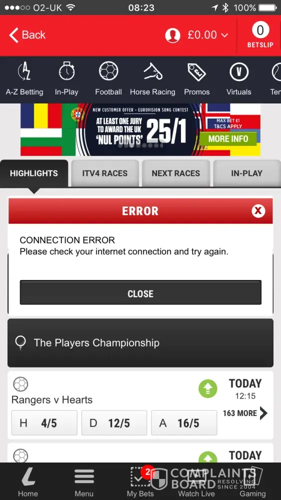 For the past few weeks I have been unable to view my Accas under the my Acca tab on the app. I receive the error message check internet connection. I'm on WIFI and all my other apps are fine. It makes it really difficult to check results and cash out. I have always used ladbrokes but I'm considering swapping to another site