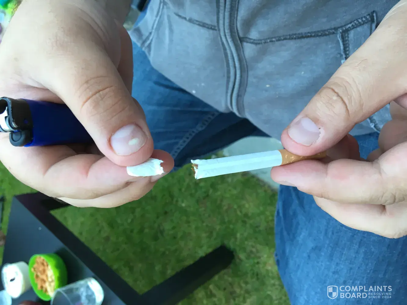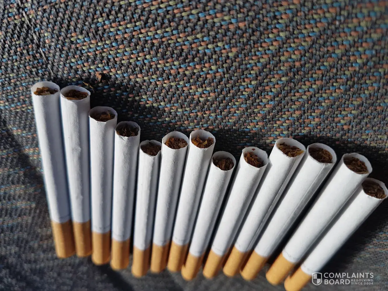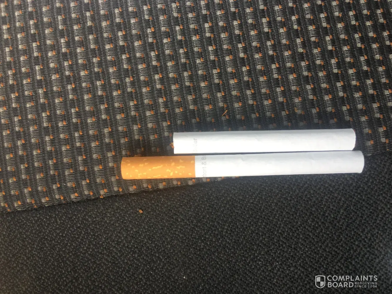 I know cigarettes are full of crap and give you cancer but it's my choice to smoke them knowing this information so that's my own fault, however when I pulled a cigarette out of the packet and a lump of rubber falls out of the cigarette that is your problem, on closer inspection I know that this bit of rubber is made of a tennis ball as I can see the unique colour green fuzz attached to it, as I have previously stated it is my choice to smoke but I choose to smoke tobacco not a chopped up tennis ball that is obviously being used to 'bulk up' the cigarette. I want an inquiry as to why this has happened please.