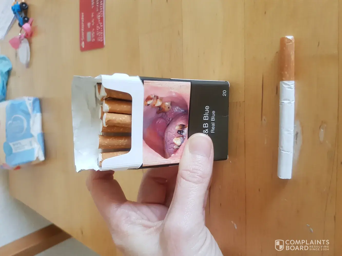 Hi, I opened a packet of L&B real blue today to find the end cigarette on the left of the packet, I can only describe as squashed and out of normal shape? As you can see from my photos the packet is not damaged on outside so can only presume it from packaging process? I have never had this before which is why I contacting yourself s about it.