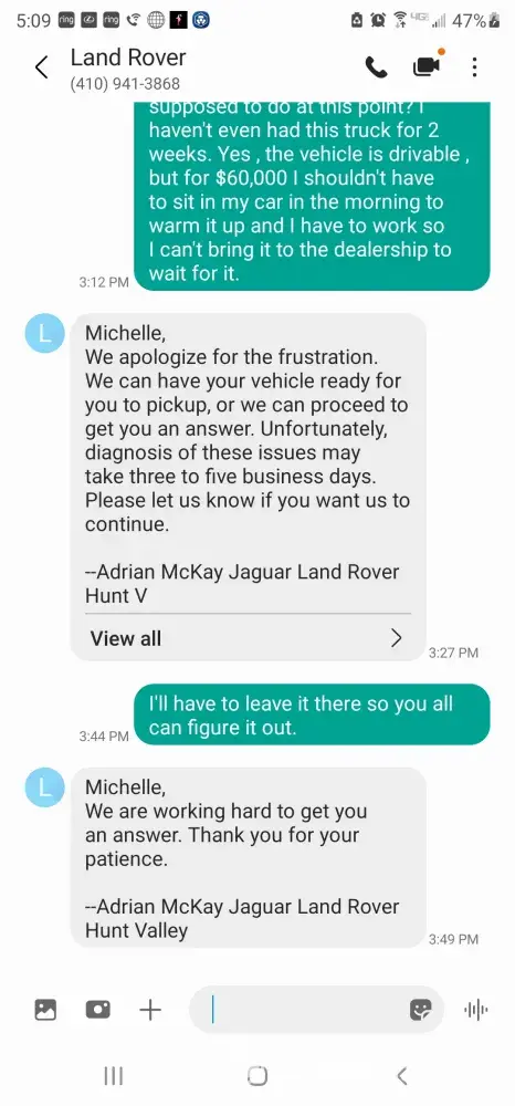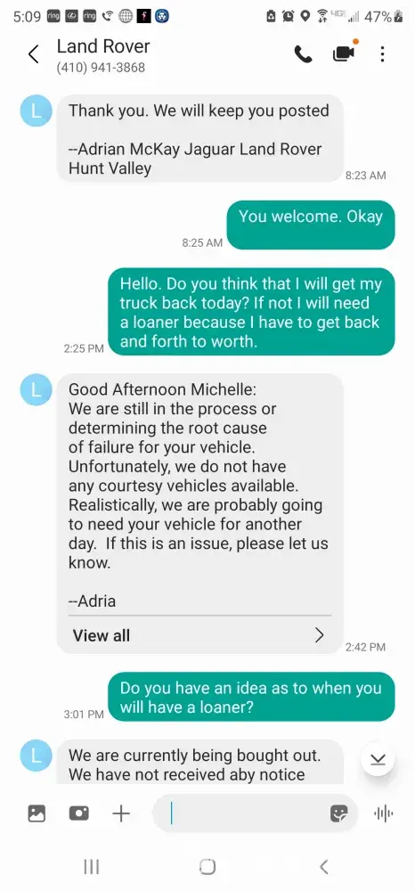 at 8:15 am asking for my username, password and pin number in order to proceed with the diagnosis and they would keep me posted. I never heard anything back so I reached out via text at 2:25 along with a phone call asking if I would get my vehicle back today and if not I would need a loaner. I was advised that they were still in process of determining the problem and they had no courtesy vehicles and would need my vehicle for another day. After asking when they would have a loaner vehicle available, I was told they were being bought out and had not received any notice of when courtesy vehicles will be provided. I was then told that I could pick up my vehicle or they can keep it to further diagnose the problem which could take 3 to 5 business days. I decided to leave my vehicle, but I reached back out to Land Rover Customer Service to see if maybe they had a solution to my problem since I'm sure there have been other people who had the same issue. The young lady I spoke with ( I believe her name is Patrese), contacted the service department and spoke with the Service Manager Grant. Grant informed her that my vehicle has yet to be in for service and is scheduled for tomorrow morning and should be in and out. Patrese asked him about a loaner vehicle and he told her because of Covid and the car shortage, they didn't have any. I tried reaching out to Grant but received his voicemail so I left a message . What I don't understand nor appreciate is being lied to. Why have me schedule an appointment and you never even looked at my vehicle, let alone lie to me and say that you haven't come up with a diagnosis . Of course they couldn't because my truck is probably still sitting in the same place that I left it. I have several text messages that I will include below of the lies that I was told which is completely different from what was told to Patrese. I have been inconvenienced by having my vehicle sit in the shop without it ever being looked at and now I have to be inconvenienced yet another day when someone should have resolved this issue today like they were supposed to do. Not once was I able to communicate by phone with anyone in the Service Department, and had I not reached back out to your Customer Service Department, I would have no clue as to what is going on.