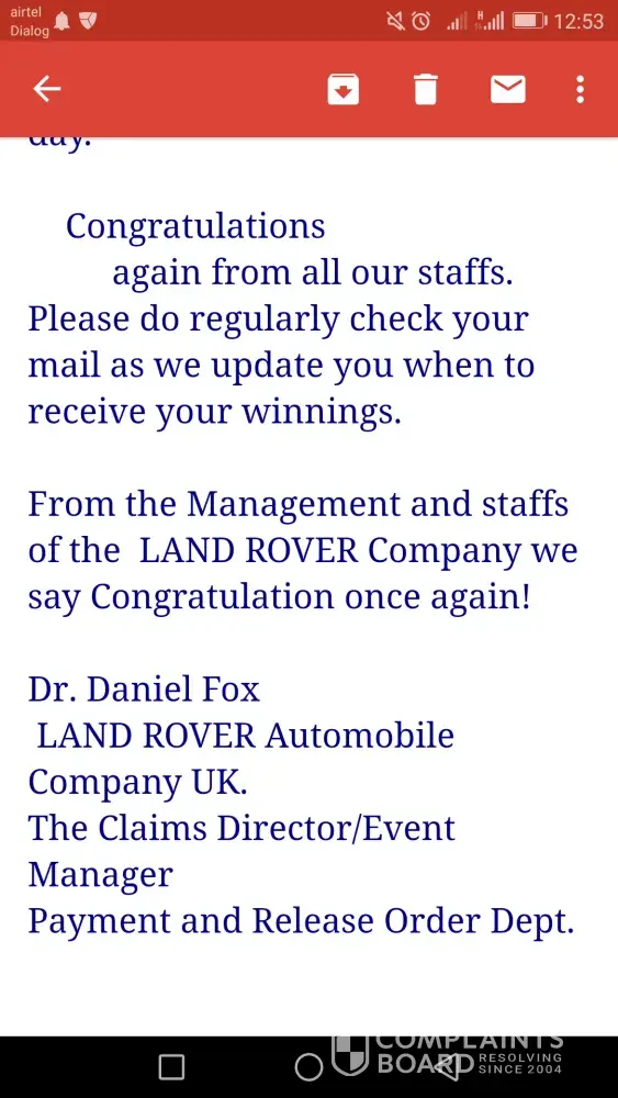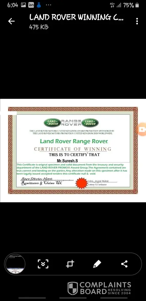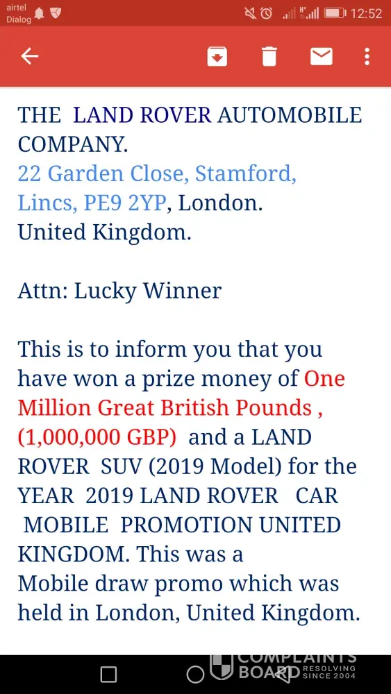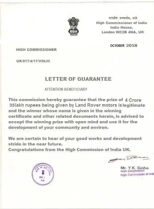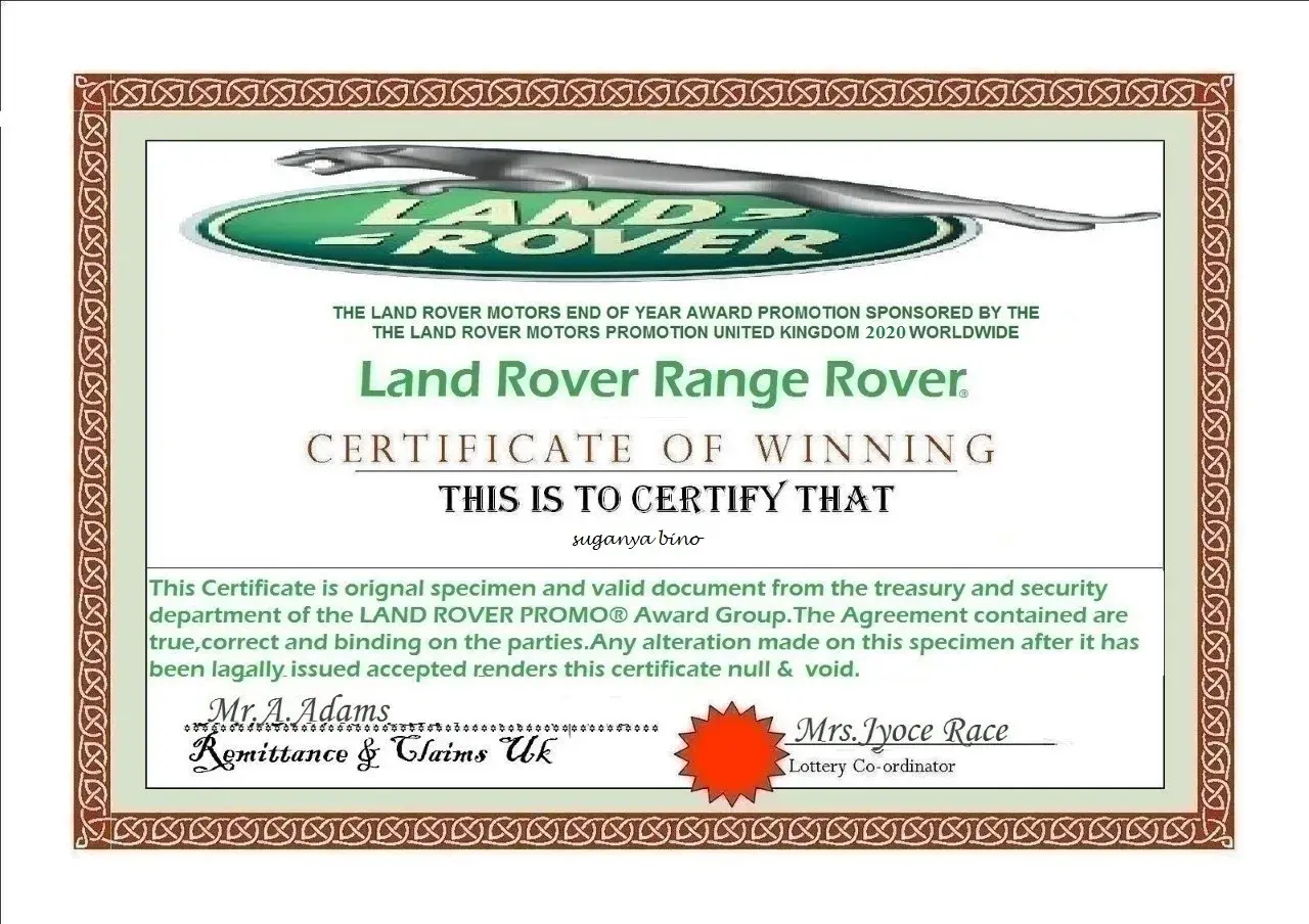 Behalf of the screening committee of united kingdom land rover online motors promotion, we wish to formally inform you that you have successfully passed the screening and verification conducted for all winners in accordance with the united kingdom land rover email/mobile number promotion terms and conditions. Hence, you are cleared for payment by the verification and fund release department of the united kingdom land rover online motors promotion headquarters and your winnings has been duly signed and approved for release to you by the legal attorney to the united kingdom land rover motors promotion. Let it be known to you that all taxes has been paid by england land rover motors united kingdom, therefore, you will only be required to pay local custom duty custom notarization clearance fee of 24, 500.00 inr to india custom duty fee in clearing of your consignment from the custom duties in your country india. Our delivery officer, mr. Phillip morris from the fedex courier services will be arriving in india tomorrow morning. And you are to provide him a copy of your id prove (id card/ passport / voters card pan card or any valid id proof) to enable him identify you before he will handover your parcel to you. Below is his flight information. B. A flight information has already been sent to our dispatch officer and you have to contact his email so that he can furnish you with time of arrival in your country. Congratulations from all staff of land rover motors promotion company uk and do feel free to call the below office for more information. More also be inform that your winning prize amount his protected by hard cover insurance policy in your name which make it impossible to deduct from the awarded prize amount that make you responsible for the payment for the required amount for the tax clearance. Departure date: 09/05/2014 time: 10:15:00 p. M (uk time) arrival date: 10/05/2014 time: 9:45 a. M (india time) your parcel contains all of the following items.1) a demand draft of rs, 4, 65, 000, 000.00/inr2) your land rover suv/range rover sport 2013 model key's and document3) affidavit of claims eligibility 4) other land rover documents.5) fund release order from financial service authority (f. S. A) united kingdomplease be aware that your land rover suv/range rover sport 2013 model has already be shipped to your country with your address provided to us and will arrive india two weeks after you have received your authorized draft been cleared in your country india. Our delivery officer will instruct you immediately he arrived india by british airway on, 10th may, 2014 by 09.45 a. M. He will put a call across to you immediately he arrived india and you are to make sure that you oblige to his instruction by remitting a payment of three hundred pounds (£300.00) equivalent in india currency twenty four thousand five hundred india rupees (rs, 24, 500.00 inr) for india income custom duty notarization clearance fee levied upon your foreign draft for endorsement and approval and your land rover. Payment must be made by you as the sole beneficiary of the certified draft and land rover suv/range rover sport 2013 model as we have contacted the india home financial ministry and they have given endorsement as regards to international monetary funds regulatory policy (imf) adopted by the india home finance ministry. You are to contact our senior delivery officer via email id: [protected]@hotmail.com and provide him with any of your identity proof. You have to give us confirmation of this mail before our accredited courier delivery officer commence to your country and also make arrangement for the requested amount that will be paid in your country to avoid any further delay with india custom when he arrived india. Your winning certificate is been attached to your mail and our delivery officer identity for your confirmation purpose. Do not hesitate to contact this office via telephone or email if the need arises. For security reasons, you are advised to keep your consignment code: lrvqta4xxxx confidential till your parcel deliver to you. This is part of our precautionary