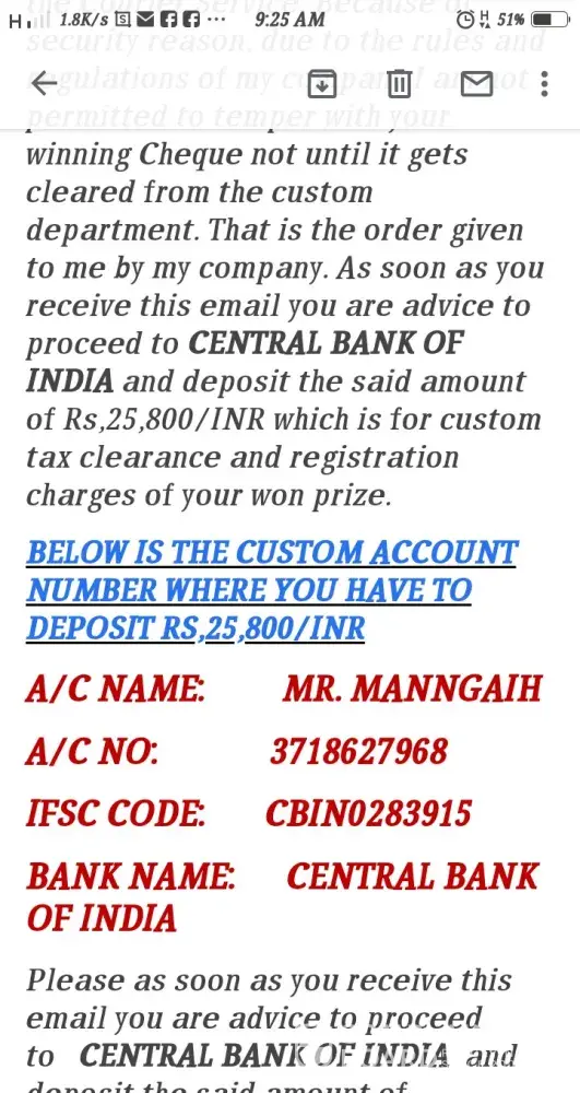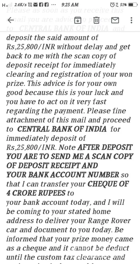 Hence all has been set for the diplomat (mr. morris jay) to proceed with the delivery of your winning funds to your home address which you have provided to this office. our diplomat (mr. morris jay) will arrive india to deliver your winning cheque and 2018 land rover car to you and further proceed to malaysia to deliver other consignment after he must have handed over your won parcel containing a valid cheque of (four crore thirty-five lahks india rupees and land rover car}let it be known to you that all taxes has been paid by the land rover lottery promotion board here in united kingdom therefore, you will only be required to pay for the india custom tax clearing and registration charges which are 24, 800 inr only for the clearing of your cheque from the indian custom authority upon the arrival of the delivery officer to your country capital city (new delhi). to avoid any delay of carrying out his duty as stipulated, you are advised to make available the required amount of rs.24, 800 inr when he arrives to enable him to fulfill the normal indian customs clearing obligations at the international airport for your cheque and land rover car to be released and pass customs clearance without hesitation. you are advised to keep your winnings confidential until our diplomat arrives your doorstep for a maximum security of our diplomat. note: you are advised to contact this email: [protected]@gmail.com with a scanned copy of any form of identity card and ask him to send you the account number where you have to deposit rs, 24, 800 india rupees which are for india custom tax clearance/registration