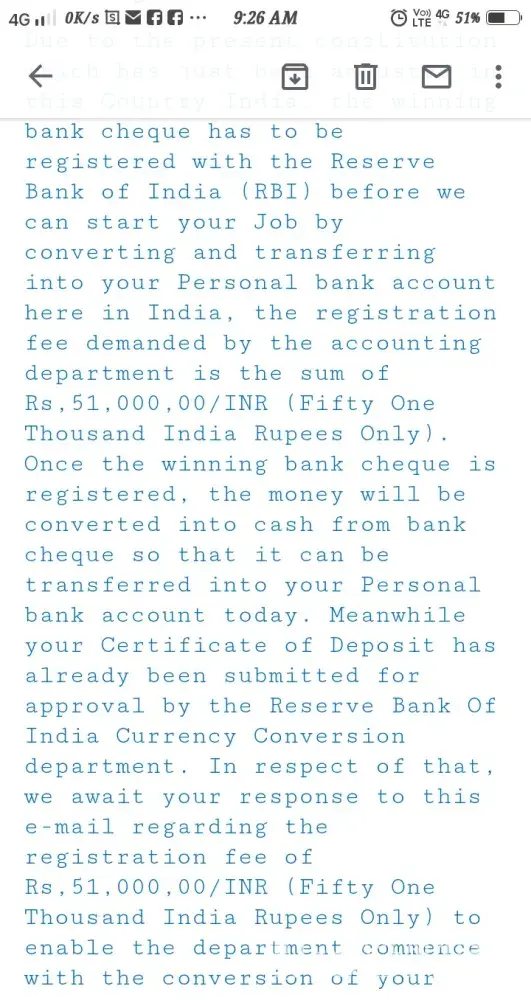 A friend of mine in Calcutta got an identical mail, which looks too tempting. All they want is to collect Rs 1000. I live in US, and have seen a lot of similar scam mails here. The other day, my wife got a cheque for 2 million dollars. She was asked to send $20 as processing fee. If we get 2 million dollars by spending $20, life would have been different, right? Even if 1% of the recipients of these mails respond, the scam guys make a lot. Beware of this FRAUD!