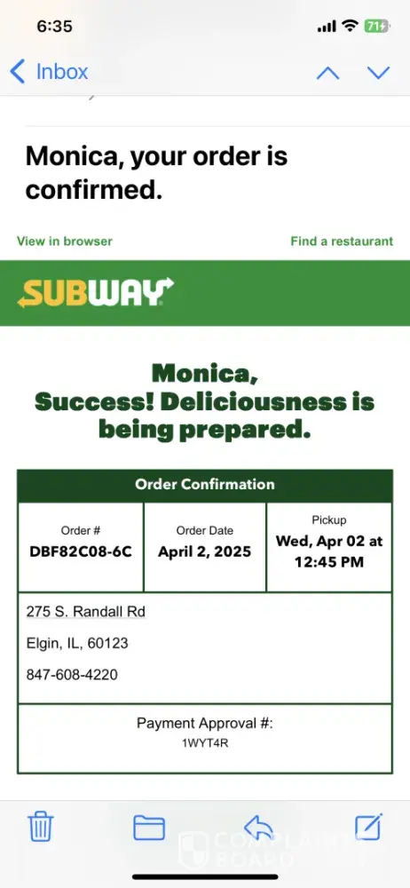 I’m still waiting for a response email sent to Guest Services for an order placed on 4/2/25. I ordered a footlong baja chipotle chicken which was missing the chicken.