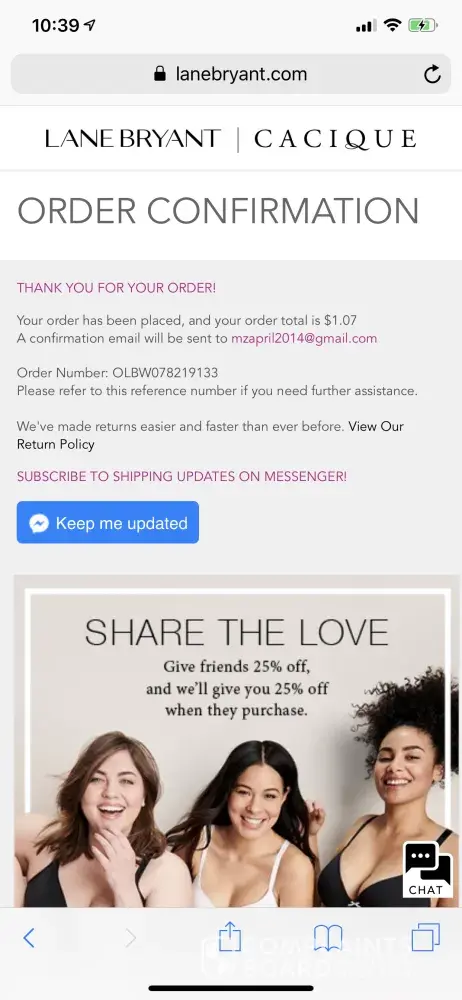 Ok on i believe 8/2 i went on your site after seeing a email for $20 off full price bra well i looked around seen the scoop neck bralette one and put in my cart well the bra was $20.99 my total came to .99 $1.07 with tax i thought Woow now that's a deal so i order 4 more, they charge my card 5x for 1.07 that's still on hold but 2 days later they cancel my order! Well i chat will a couple rude people who just don't care not going to honor it the computer made a mistake and that's it pretty much your SOL which is bs! So i decided i will email and speak about it, well next morning i read a email stating they would honor it just purchase the bra and call back within 14 days and they would fix it so i didn't want to order and them not fix it so i decided i would chat and have them do it so i can make sure it worked! Well got the same rude one from day before so i emailed back pretty much a back and forth thing! But i tell you what i WILL NOT shop with a company who does not honor their prices nor stand by their word, i never put in a code i put a bra in cart said $.99 i ordered and now canceled due to company site messing up, don't understand how that's my fault i mean my card was still charged rather y'all still got on hold or not it's pulled on hold as we speak still this is false advertisement, not honoring YOUR price online and not standing by your word as the representative said y'all would honor! This company is bogus is what I'm getting out of it!