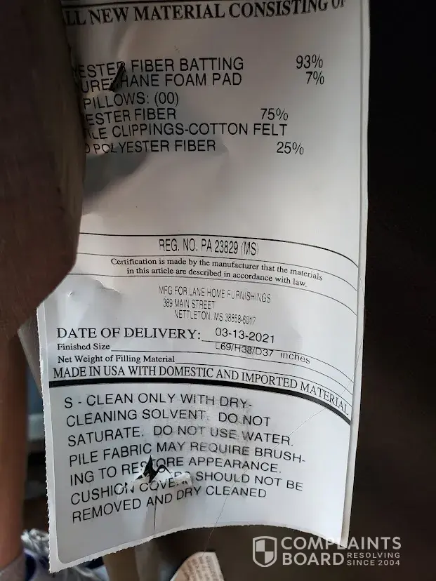 I bought a couch and loveseat at the beginning of April last year at American Freight Furniture in West Plains MO. I have had multiple claims on this furniture and it is garbage! The arm is caved in, the fabric is peeling and this was only after a month! I filed a claim, and "the law tags were not good enough" the next one I filed, the same answer... I have made at least 50 calls checking on the status of our claim. And remember, time goes on... and it gets worse and worse! I am embarrassed for people to come in our lake house because the shape of the NEW furniture is horrible. I will not buy another piece of LANE furniture again. I even paid extra for an extended warranty on this furniture! The law tag that they require, is underneath one of the legs of the couch... I would have to remove the leg to take the picture that they are wanting!