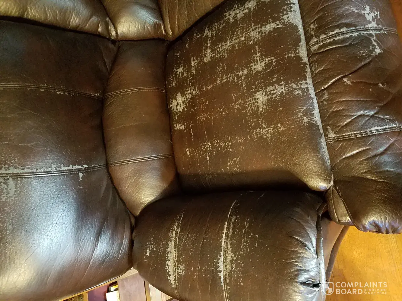 I bought a Simmons couch less than two years ago and the material is peeling off. It supposed to be leather according to the brochure, but its not! Its more like pleather than has hardly ever been sat on. According to the brochure if their is any excessive soiling, improper cleaning, ect will void the warrenty. None of the above has been done to this chair and i deserve a full refund because this is false adsvertisment.