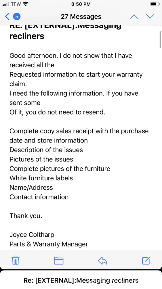 Hi My Name is Juvy Villamar and I'm writing because we bought are furniture at sears last April 29, 2017. Sears told us that they can't do anything since the manufacturer warranty is over. So I just want to show it to you that our couch is barely use it and now it's starting to peeling off and it's really ugly and we are so dissappointed because we paid $1600 and it's only last for 2 years I know some people can easily buy a new one but the purpose of buying an expensive one is to last at least 5 to 7 years not 2 years. I hope you can able to do something with our couch.
