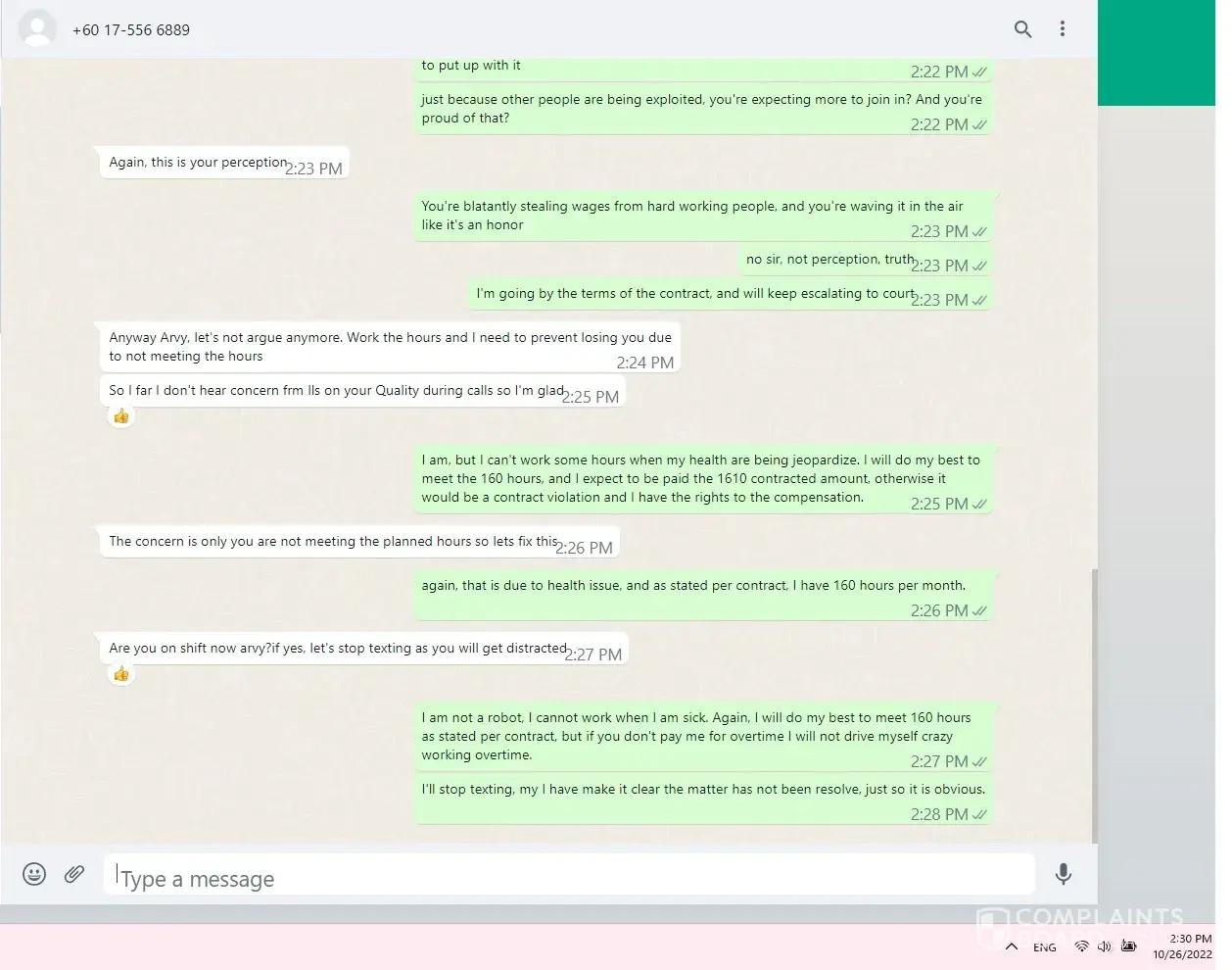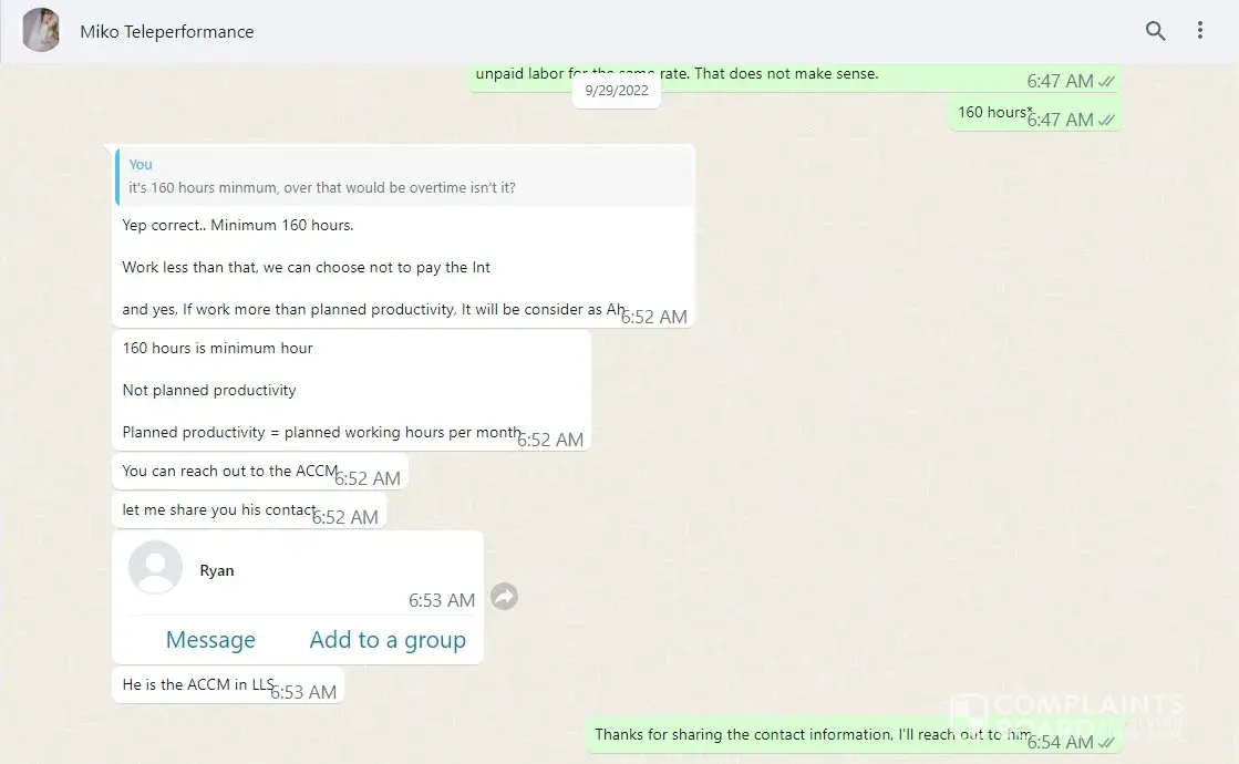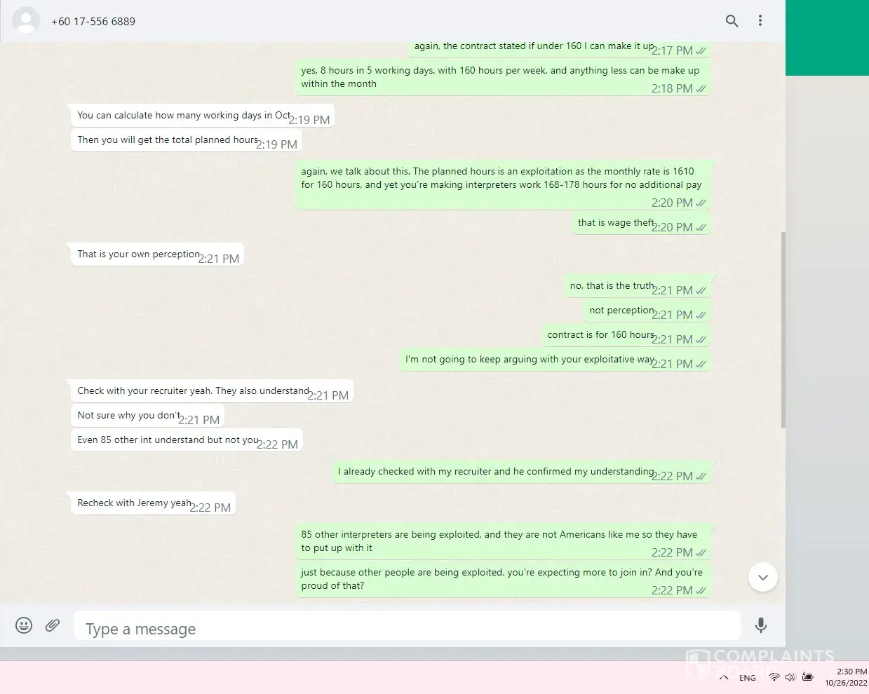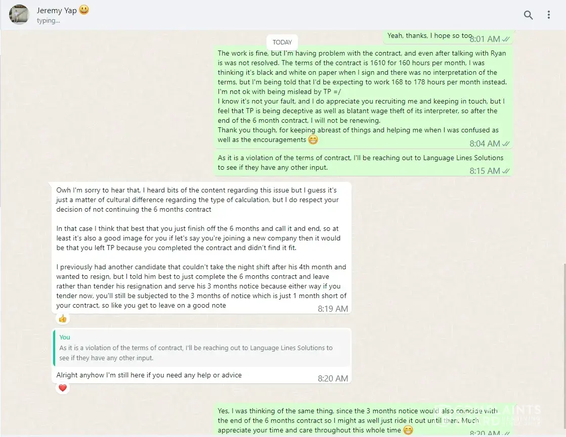 I signed a contract with both LLS and Teleperformance, with their brand together on some pages. LLS is knowingly employing TP's services, as being a branch of the main TP, they are knowingly cooperating with TP on the contract of overseas interpreter in forcing them to work 8 hours per day, working more than 160 hours but interpreters will not get paid over the 160 hours, but working less than the "planned production" hours will get paid less than the 160 hours contract as stated. I have talk with TP and they said LLS had reached out to them about my working less than the 9 hours including 1 hour break 'working days' and that LLS is threatening to close my working account unless I met the "planned hours". That is a collaboration exploitation by LLS and TP.
