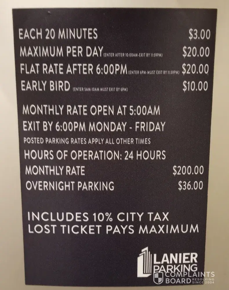 Lanier Parking Solutions’s earns a 2.0-star rating from 0 reviews and 8 complaints, showing that the majority of clients are somewhat dissatisfied with parking services.