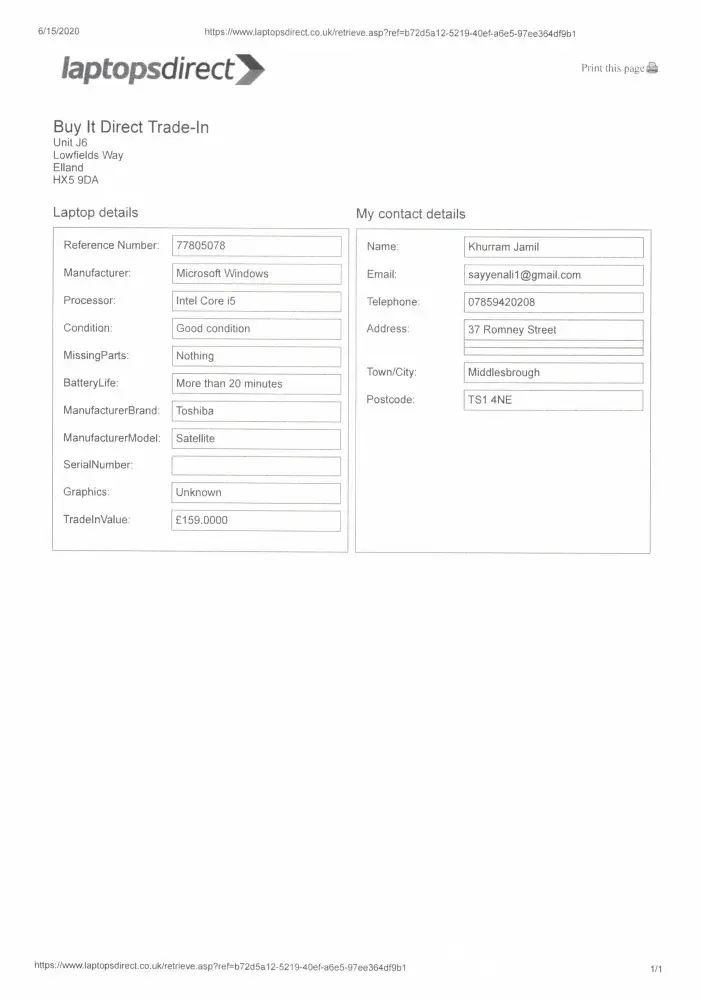 I sold my laptop to laptops direct via their website and send it off to them on 17 june 2020 and they received it on 19 june 2020. They asked to use collect+ as courier service and have tracking number j7799n7. I have chased them for past 1 and half month and they said they need 30 working days to evaluate my laptop before they send off any offer to me which I haven't received yet. I spoke to them today 10 august 2020, gave them trade in id [protected], email id and post code and they still could not find my order. I have attached the order details with my complaint as a proof that I sold my laptop to them. My email id is [protected]@gmail.com.