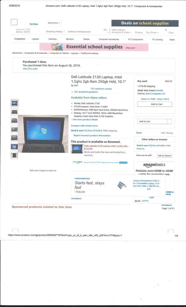 Dear Sir/Madam. i am filing an complaint that I bought from Amazon/seller: AL Divine Computers. They're located at 1131 Clinton Avenue, Irvington, New Jersey 07111. I order the item on Monday, August 26, 2019. For $74.08 + tax $6.37 = $80.65. I received on Wednesday, August 28, 2019. By the UPS and Who sign for the item is my brother, Raul Bobet. Below of...