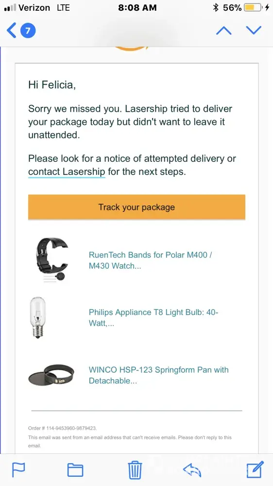 I ordered some items from Amazon for same day shipping. Was home all day and got a notification that my package was delivered. No one buzzed or rang my apartment. Nothing. I walk downstairs and there's no package. It said it was left in the front door but nothing. This is the second time in a row, in a month span, that my package was "delivered" by Lasership and I received nothing. I despise Lasership and have called them and complained and all they tell me is that they'll start an investigation. Never hear back from them.