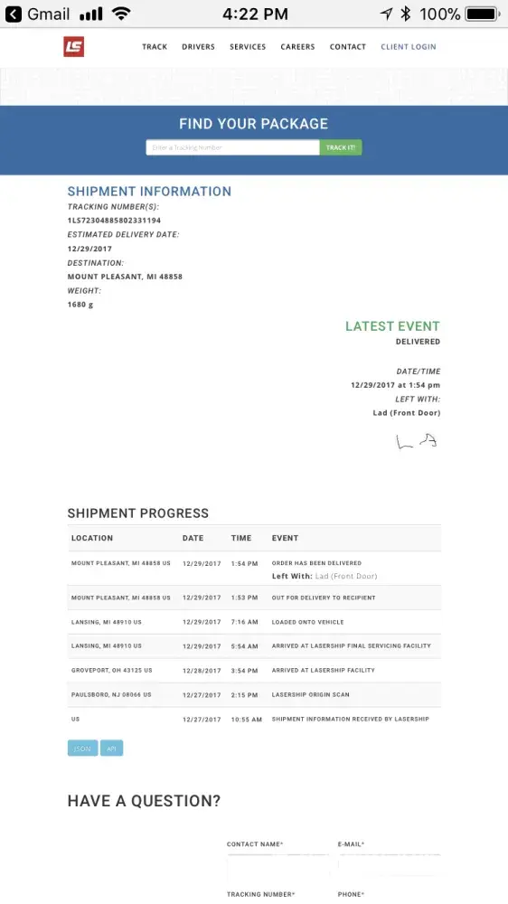 LaserShip shipment never delivered tracking id lx32012725