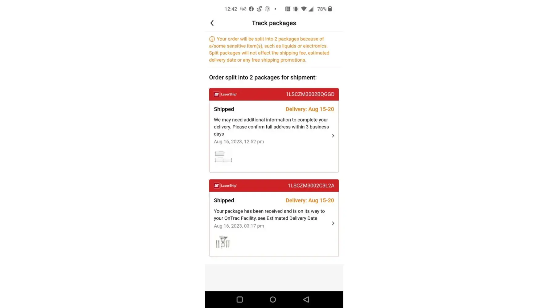 8/16/2023 Lasership delivered did not happen. On Lasership page says they did not have address to deliver my package at 5:40pm. At 10:15am Lasership delivered my package at my place. Nope they did not. Then add another package was part of it was on 8/17/2023 LaserShip delivery. That didn't happen. At 3:30 p.m. package had delivered at my place at 11:10 a.m. next door on the left side. That didn't happen. No truck no person no pictures no video and no packages at my place on that day which is today. Trying to talk to them but nothing computer will not do nothing for you make it worse just like that company is and I'll see I believe they stole it but not. I have more package unfortunately come from them. To me I'll never use those people again leadership is definitely not leader!