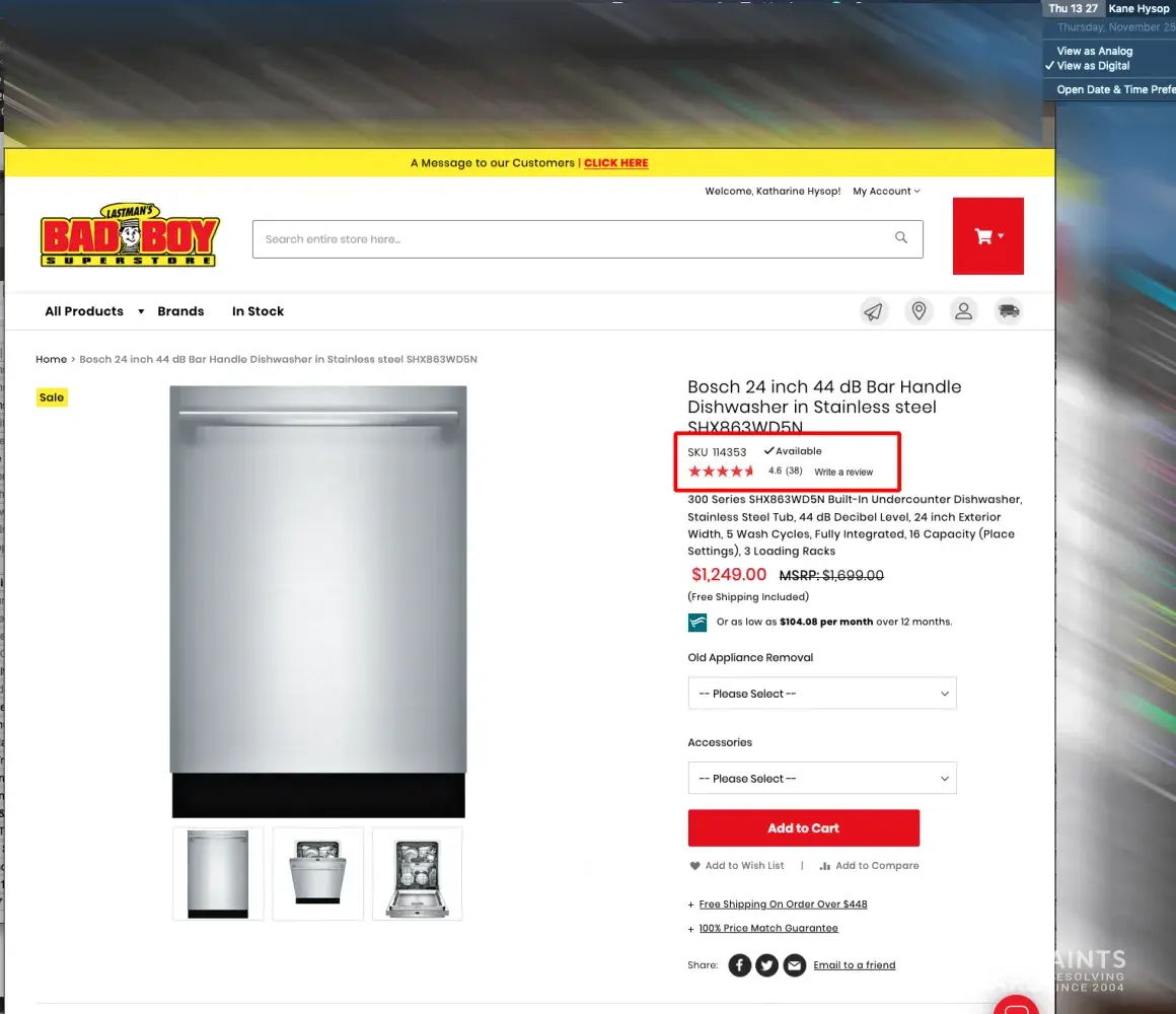 I purchased a Bosch dishwasher on Oct 11/21 because Bad Boy advertised no tax on purchases. I paid in full and received a confirmation advising me that the delivery would take place Oct 18th. No delivery took place. I called and was told the delivery was changed to Jan 12/2022. This was not acceptable to my situation as I could not wait 3 months. I spoke to...